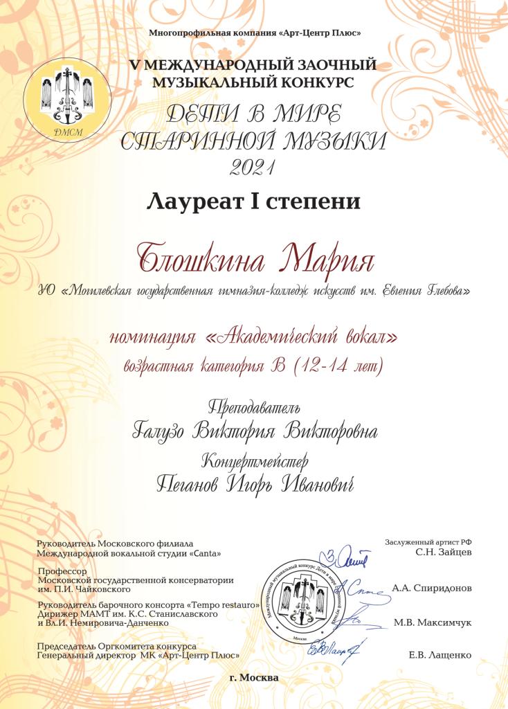 В конце февраля в Москве состоялся V Международный заочный музыкальный конкурс «Дети в мире старинной музыки». Мероприятие собрало 276 юных музыкантов из Беларуси, России, Латвии, Литвы, Украины, Греции, Молдовы, Перу и США. Учащаяся Могилевской государственной гимназии-колледжа искусств им.Е.Глебова Мария Блошкина завоевала диплом лауреата I степени (преподаватель Виктория Галузо и концертмейстер Игорь Пеганов).