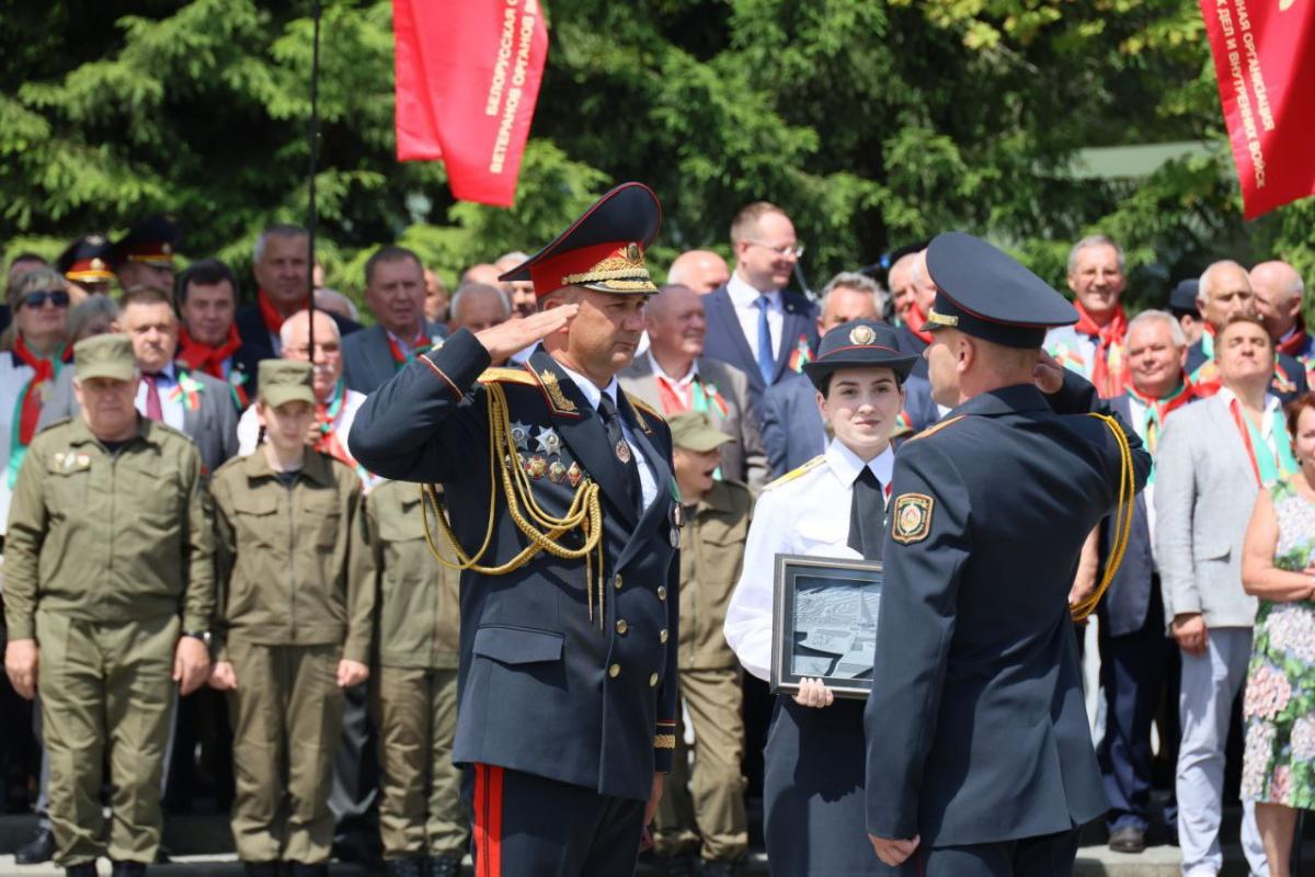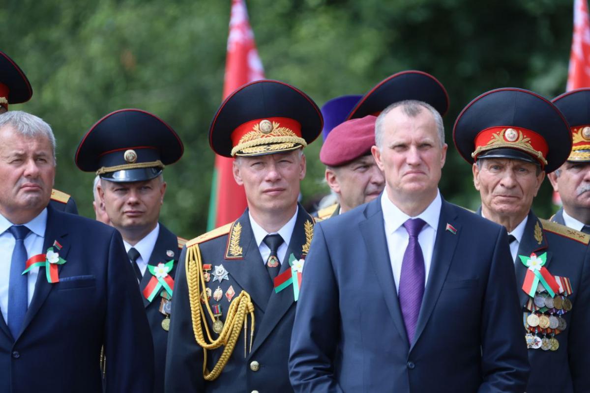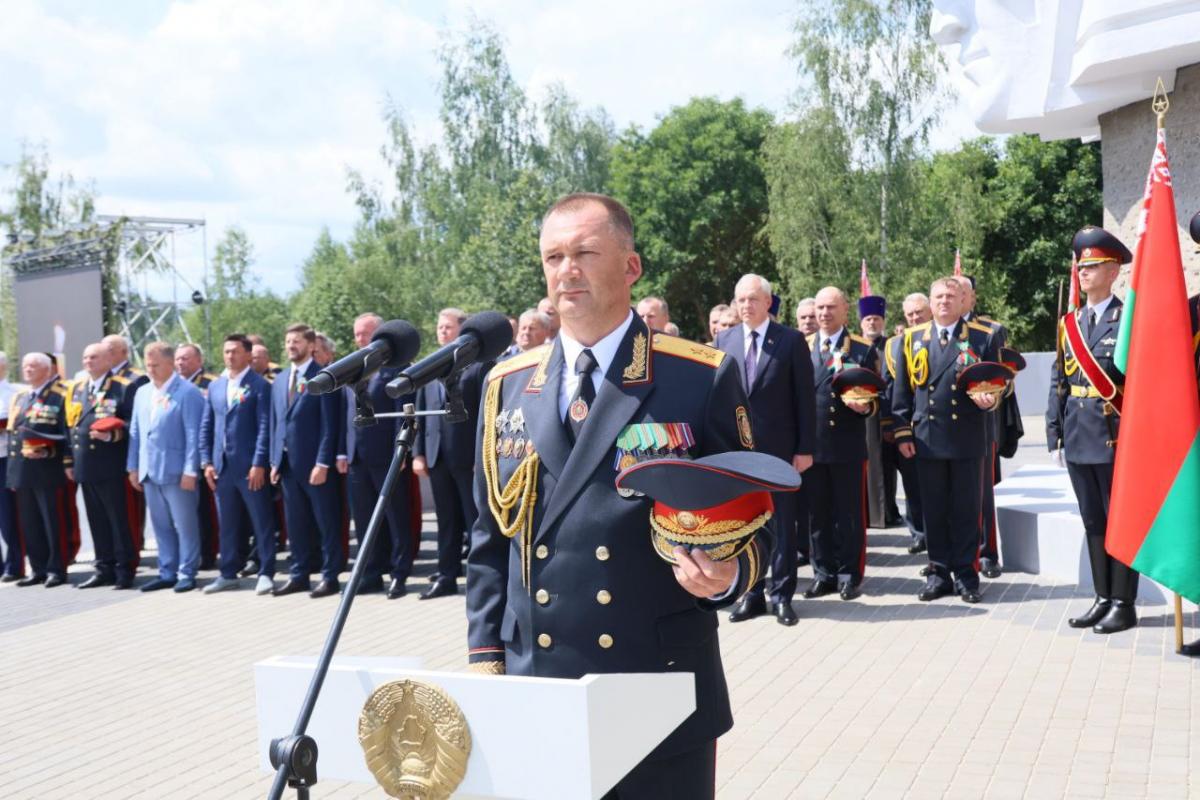 «Это знаменательное событие не только для Могилевщины, но и для нашей страны, потому что здесь в камне сохранена память о всех защитниках отечества, сотрудниках органов внутренних дел на всех этапах Великой Отечественной войны, — продолжил Игорь Сергеенко. — Оборона Могилева стала яркой страницей всенародного сопротивления врагу. Батальон под командованием Владимирова уже 12 июля 1941 года приступил к занятию обороны именно на этой высоте. В состав батальона входили сотрудники областного управления милиции НКВД Могилевской области, межкраевой школы НКВД Могилева, а также преподаватели и курсанты минской и гродненских школ — такие же молодые ребята, которые сегодня стоят в строю и служат милиции, которые придут после окончания высших учебных заведений на службу».