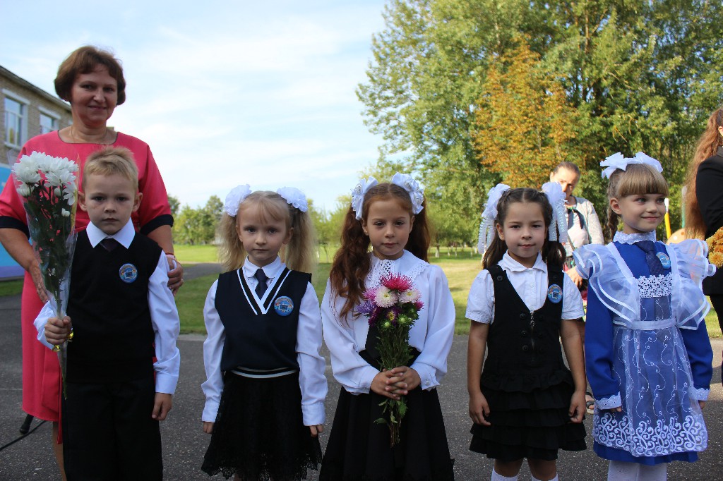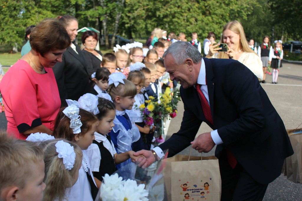 На праздничной линейке первоклассникам напутственные слова произнесли родители, педагоги, а также председатель Могилевского областного объединения профсоюзов Владимир Цумарев.