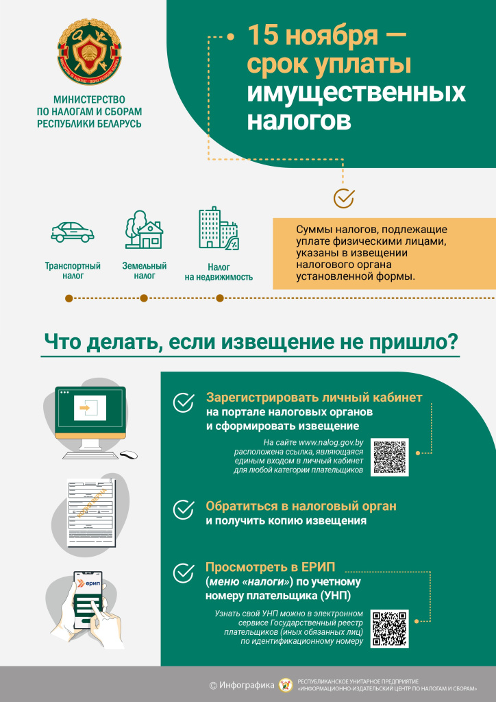 — Если у вас имеются в собственности квартиры, дома, гаражи, транспортные средства, в собственности или на праве пользования земельные участки, – вы являетесь плательщиками таких налогов, как налог на недвижимость, земельный налог и транспортный налог, — напомнили в инспекции. — Уплатить данные налоги можно через ЕРИП в банке, на почте, с помощью услуги «Интернет-банкинг», в инфокиосках.
