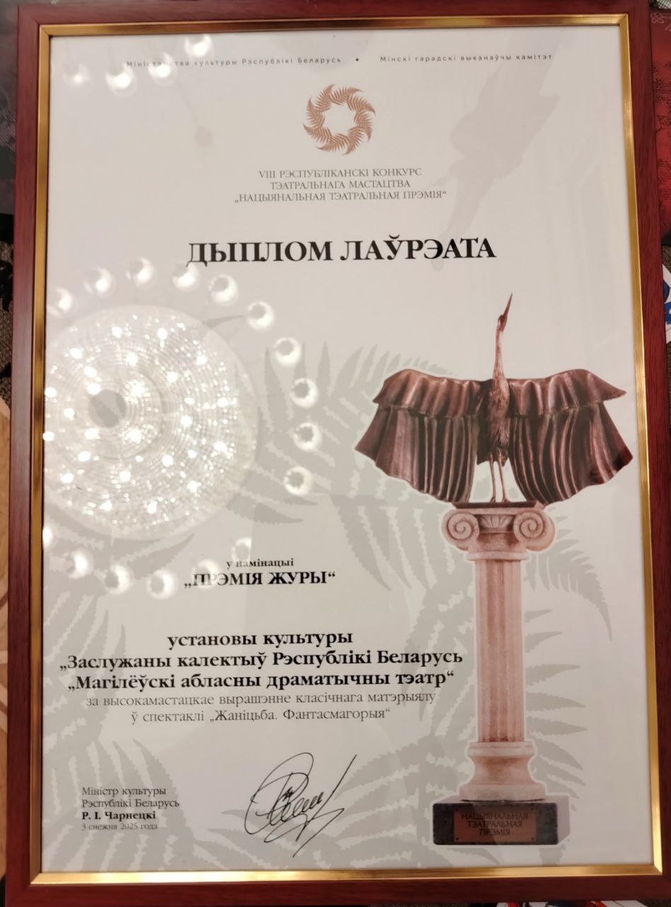 Могилевский областной драматический театр вписал яркую страницу в историю белорусской культуры, став лауреатом VIII Республиканского конкурса театрального искусства «Национальная театральная премия». Высокое признание театр получил за постановку «Женитьба. Фантасмагория» — спектакль, который был удостоен премии жюри за выдающееся высокохудожественное переосмысление классического материала.