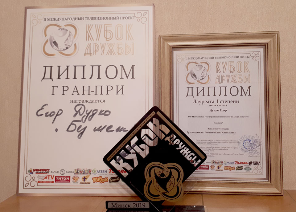 Могилевчанин Егор Дудко удостоен Гран-при II Международного телевизионного проекта «Кубок дружбы», который прошел в Минске. Оценивало юные таланты компетентное жюри, которое уже завоевало себе авторитет участием в проектах «Голос», «Я пою!», «Танцуют все!», «Евровидение», «Таленты краiны», «Украiна мае талант», «Молодые таланты Беларуси» и многих других.