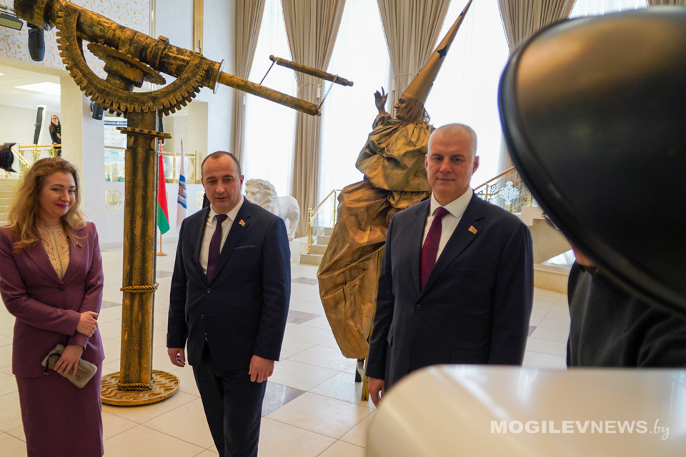 Еще до начала официальной части гости погрузились в мир инноваций и качества Могилева. В фойе развернулась выставка и дегустация продукции могилевских предприятий. Главными «хозяевами» этой зоны стали роботы. Механические гиды рассказывали об истории города, а робо-питомцы выполняли команды.