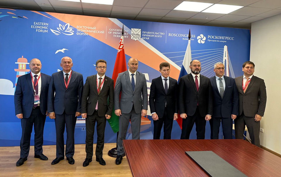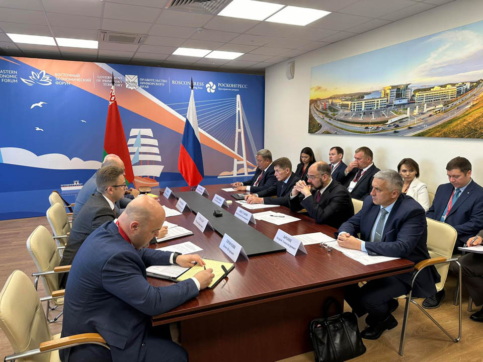 В рамках участия в IX Восточном экономическом форуме – 2024 заместитель премьер-министра Республики Беларусь по вопросам деятельности Беларуси в рамках Союзного государства и отношений с Россией, Чрезвычайный и Полномочный Посол Беларуси в России Александр Рогожник и заместитель председателя Могоблисполкома Руслан Страхар 5 сентября провели встречу с врио губернатора Хабаровского края Дмитрием Демешиным.