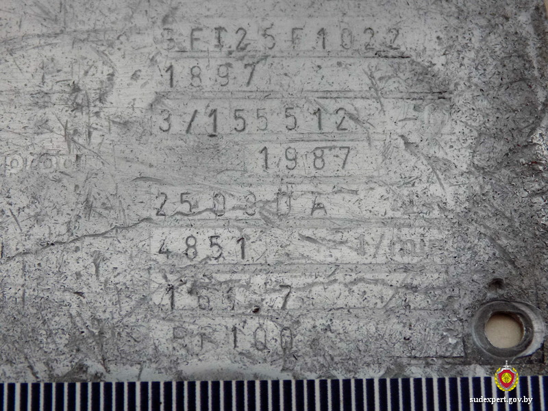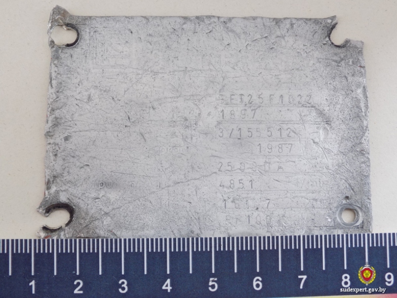 В мае в управление криминалистических экспертиз и учетов ГКСЭ по Могилевской области обратился могилевчанин с просьбой об установлении содержания информации на металлической табличке, которая закреплена на детали редуктора хода кабелеукладчика, собранного на базе импортного трактора. В связи с расположением редуктора возле гусениц трактора и постоянной эксплуатацией в сложных условиях (грунт, грязь) обозначения на табличке затерлись, стали практически не читаемыми.
