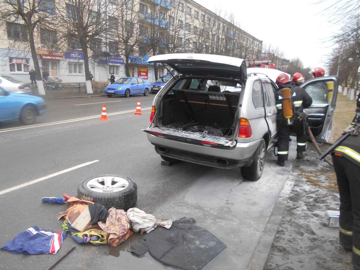 Автомобиль BMW X5 2002 года выпуска горел на ул. Октябрьской в Бобруйске днем 9 апреля. Как сообщила старший инспектор областного управления МЧС Ольга Нехороших, огнем повреждена панельная часть автомобиля.