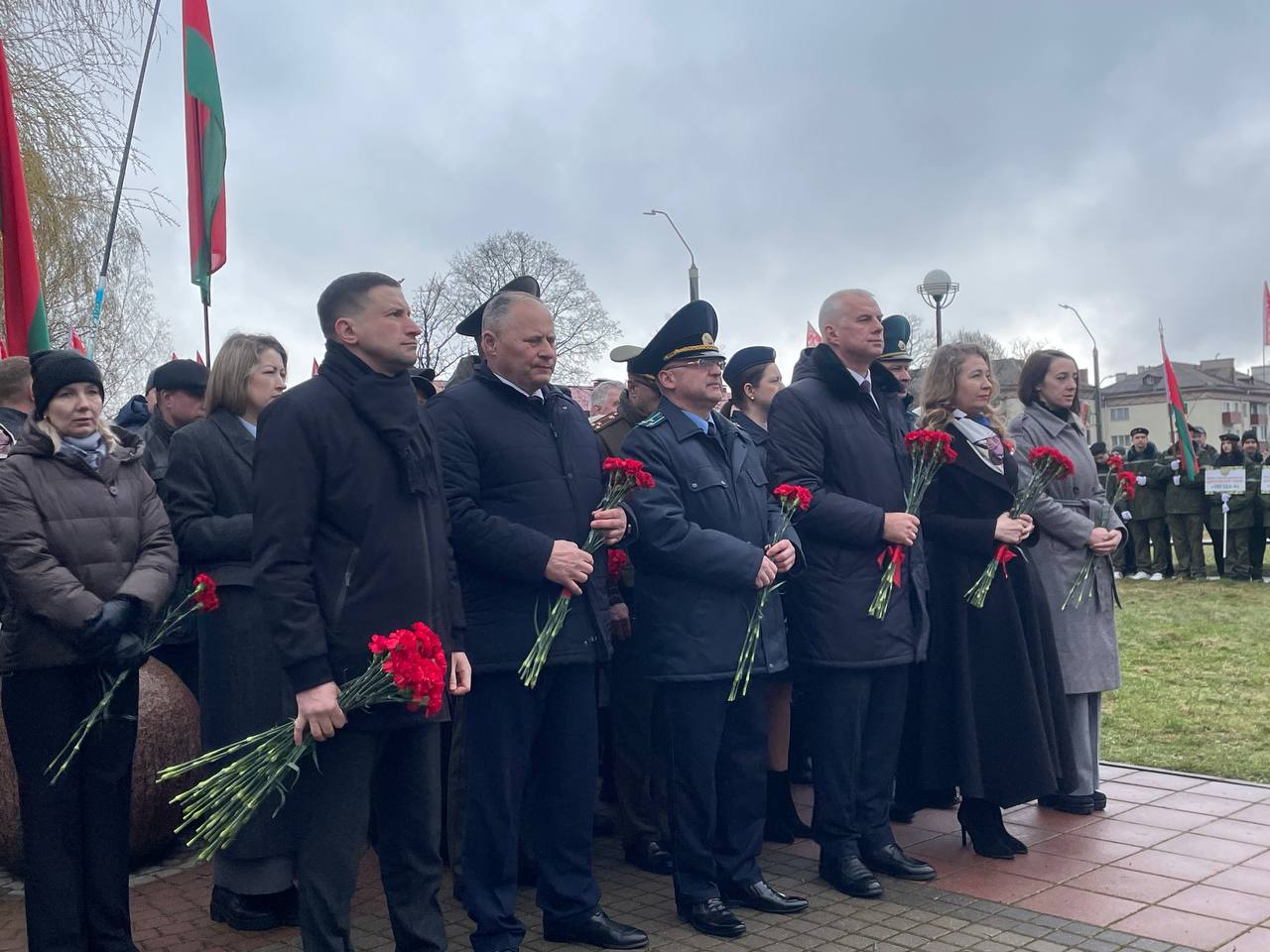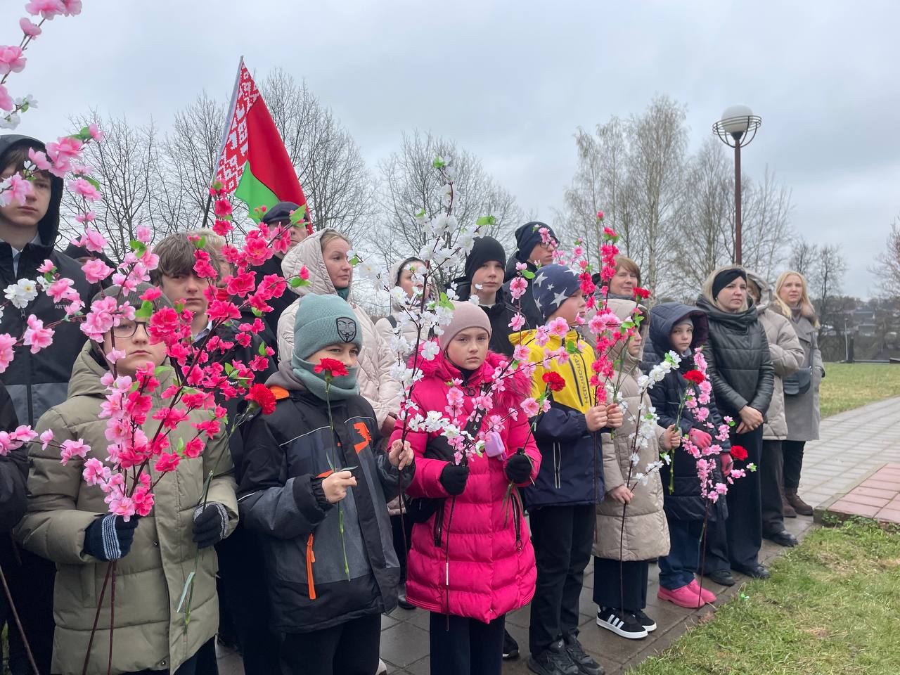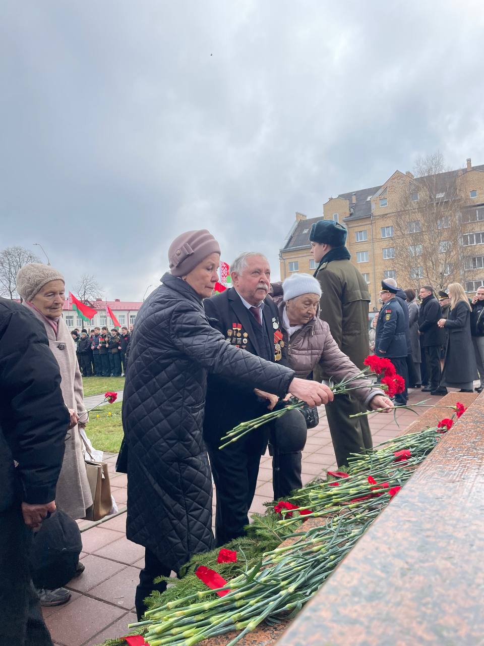 После выступлений к подножию монумента легли венки и живые цветы. В полной тишине над площадью повисла минута молчания — шестьдесят секунд, вместившие в себя скорбь по миллионам невинных жертв, сожженных деревень и оборванных детских жизней.