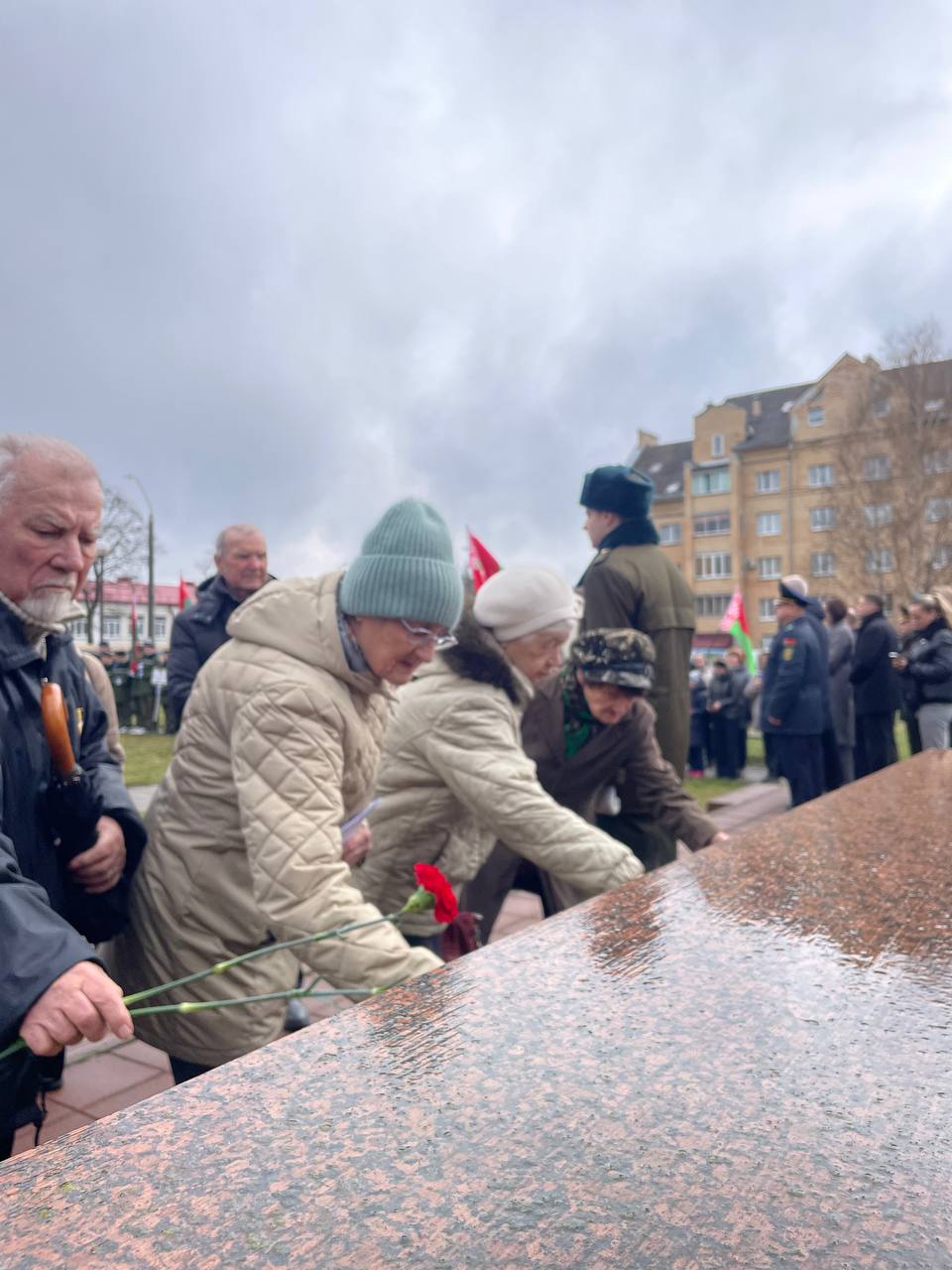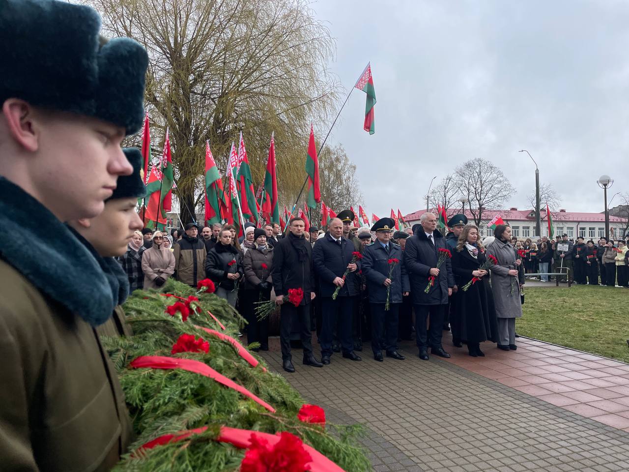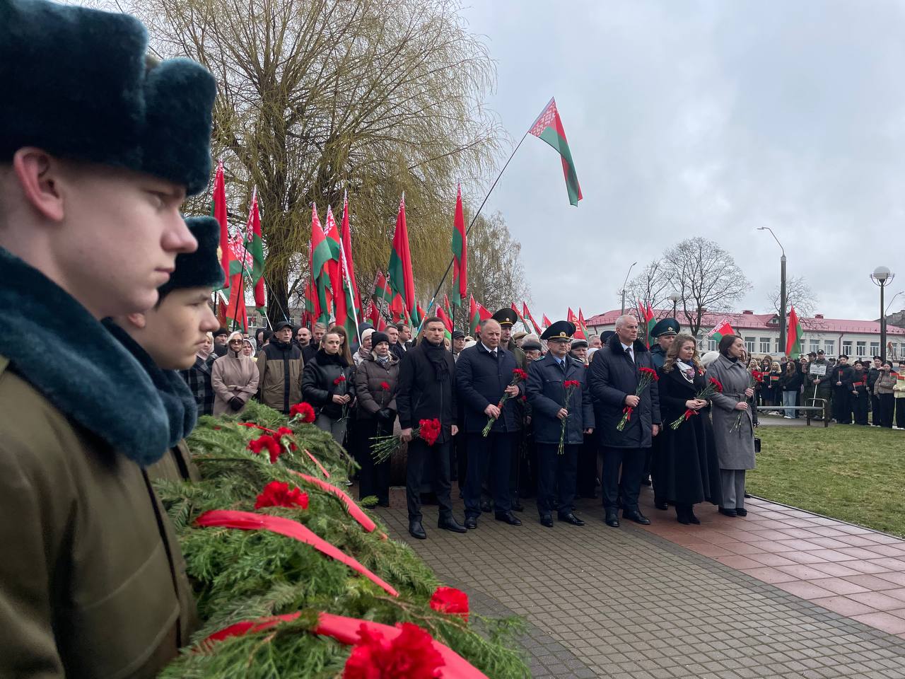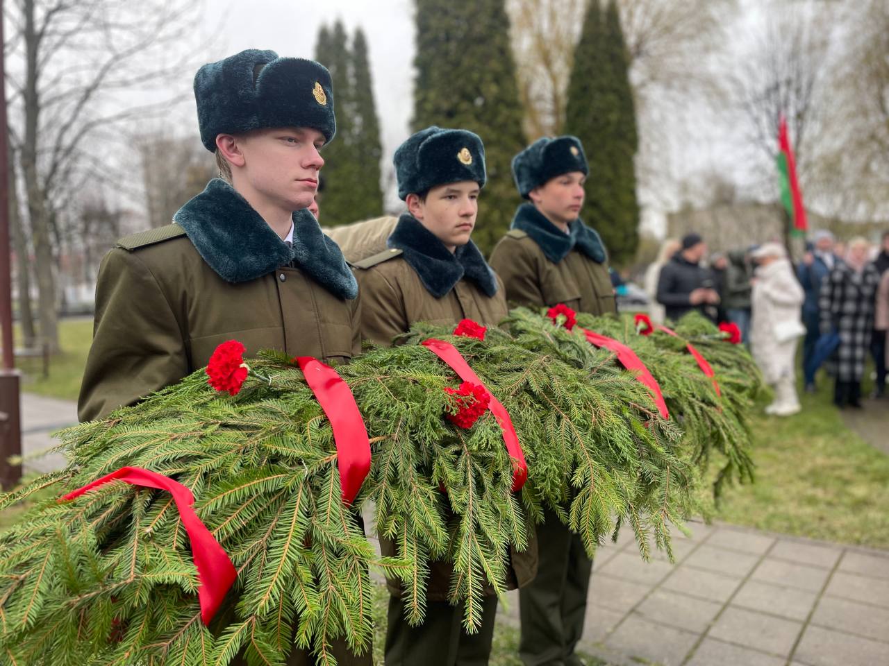 После выступлений к подножию монумента легли венки и живые цветы. В полной тишине над площадью повисла минута молчания — шестьдесят секунд, вместившие в себя скорбь по миллионам невинных жертв, сожженных деревень и оборванных детских жизней.