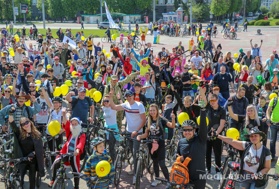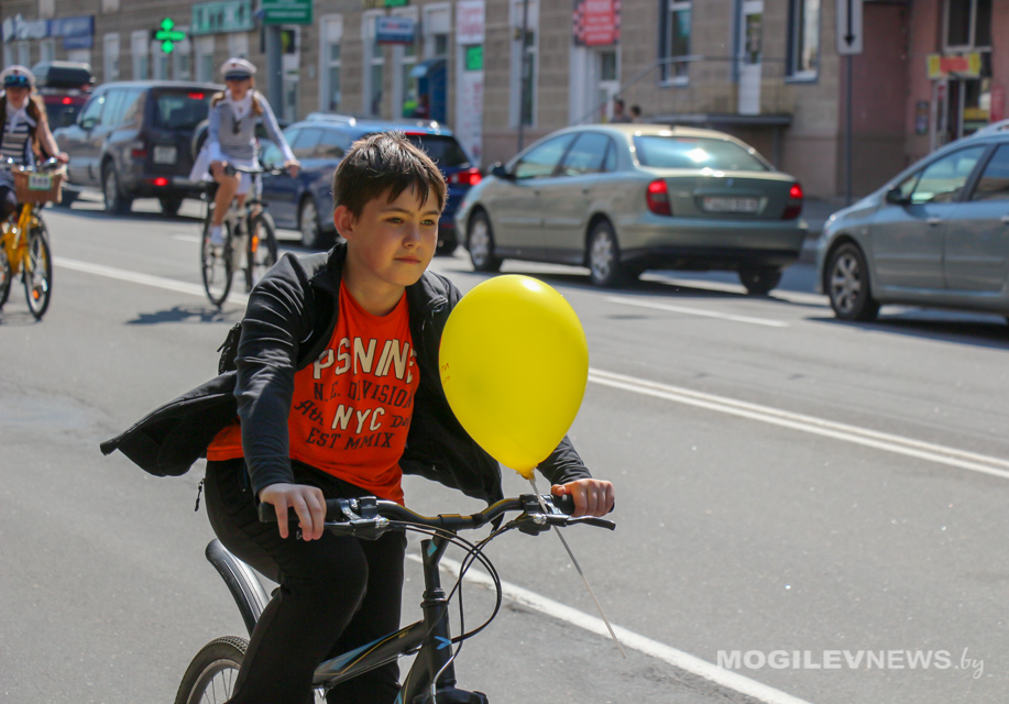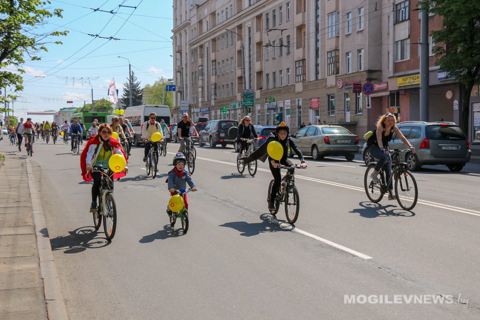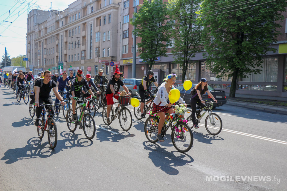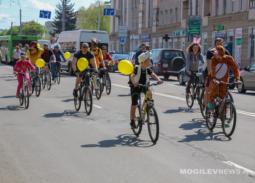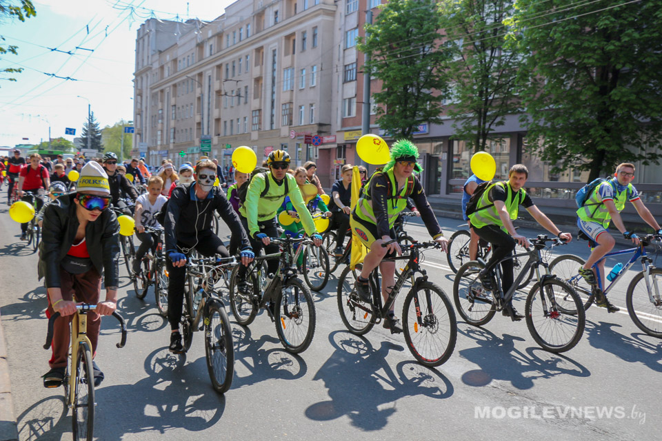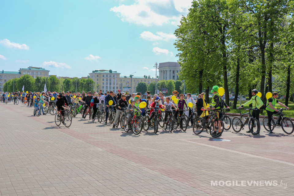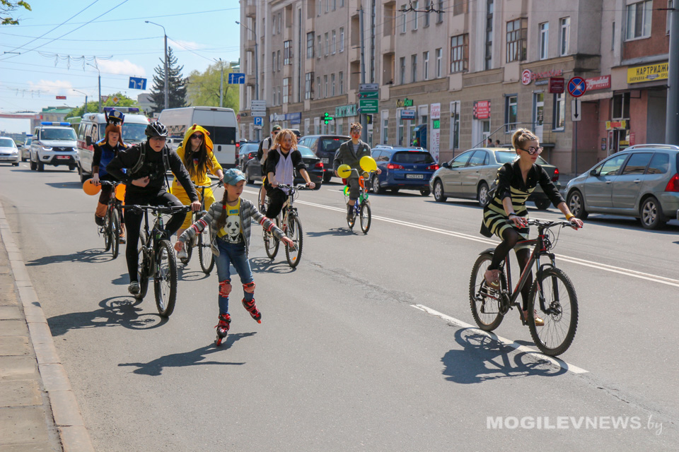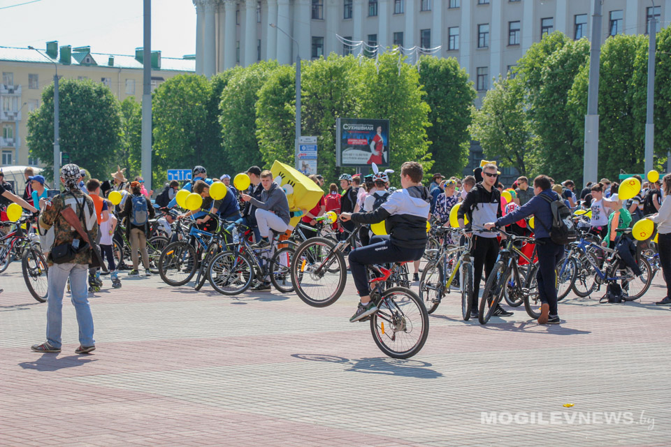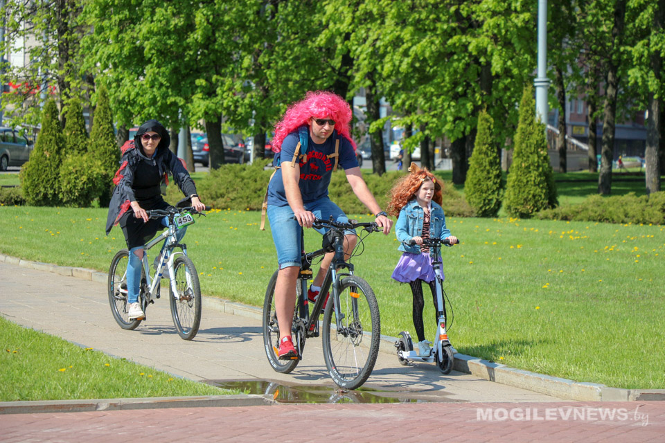 Участники Могилевского велокарнавала «ВелБелМай» проехали большой колонной на велосипедах, роликах и самокатах от площади Ленина до ТЦ «Парк-Сити».