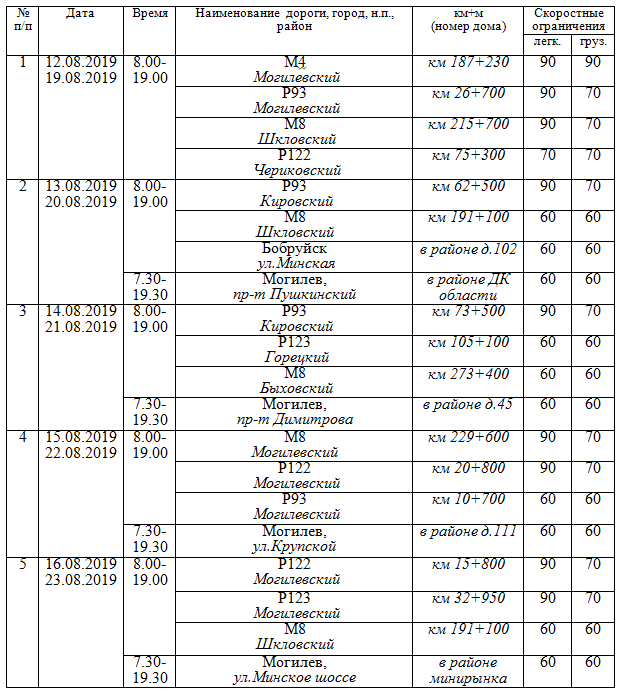 Госавтоинспекция сообщает об организации работы мобильных датчиков контроля скорости на территории Могилевской области с 12 по 25 августа.