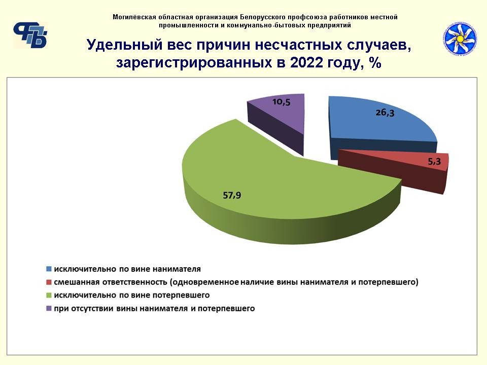 — На предприятиях, находящихся на профсоюзном обслуживании областной организации профсоюза, в 2022 году зафиксировано снижение общего уровня производственного травматизма, число пострадавших уменьшилось с 27 до 19, в том числе тяжелотравмированных с 5 до 4, получивших травмы, не относящиеся к тяжелым, с 20 до 12. К сожалению, на 1 человека – с 2 до 3 возросло число погибших, — рассказал председатель областной организации профсоюза Павел Жуйков. — Проведенный нами анализ случаев производственного травматизма, показал наличие двух тенденций. Первая — из зарегистрированных в прошлом году несчастных случаев без малого 58% произошли исключительно по вине потерпевшего, 26,3% – по вине нанимателя. Смешанная ответственность (одновременное наличие вины нанимателя и потерпевшего) зафиксирована в 5,3%, отсутствие вины нанимателя и потерпевшего – в 10,5%. Это говорит о том, что благодаря предпринимаемым на государственном уровне мерам, работе по профилактике производственного травматизма, создании здоровых и безопасных условий труда всех заинтересованных, включая профсоюзные организации, в целом нанимателями соблюдаются установленные требования в сфере охраны труда.