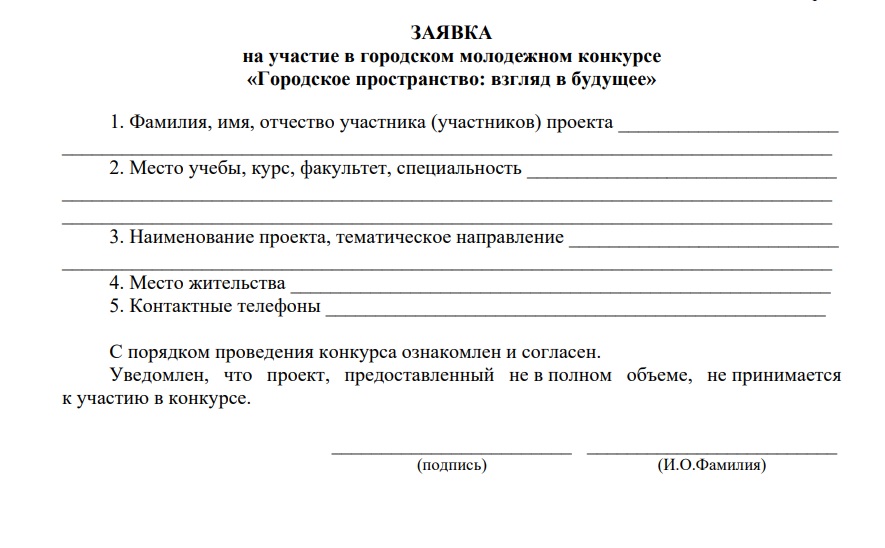 Заявки (по форме) следует направлять на e-mail konkurs.mogilev@yandex.by. К ней прилагается творческая работа (рисунок, чертеж, дизайн-проект, макет, другое в соответствии с выбранным направлением) в электронном виде в формате pdf или jpeg с описанием предлагаемого проекта либо идеи благоустройства городской среды в соответствии с выбранным направлением.