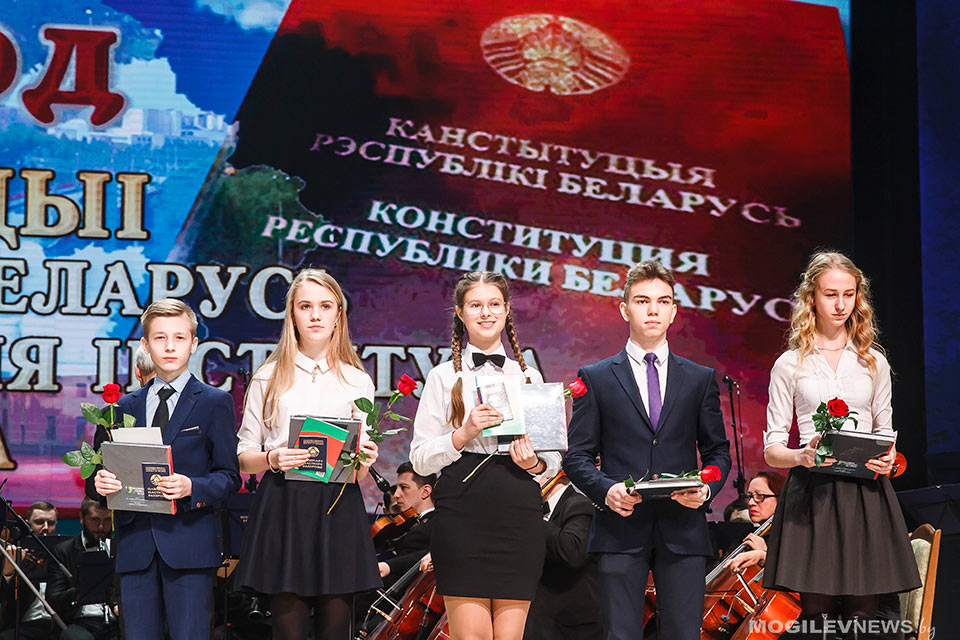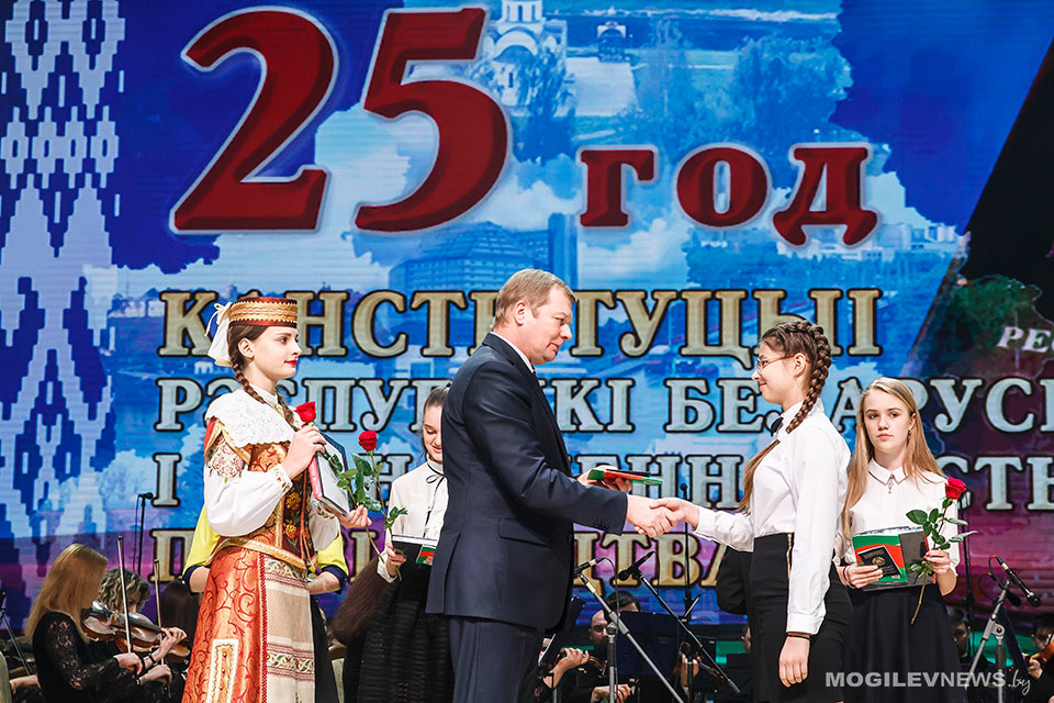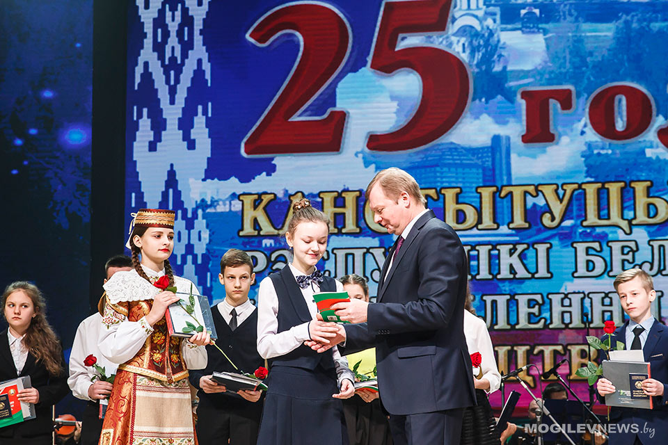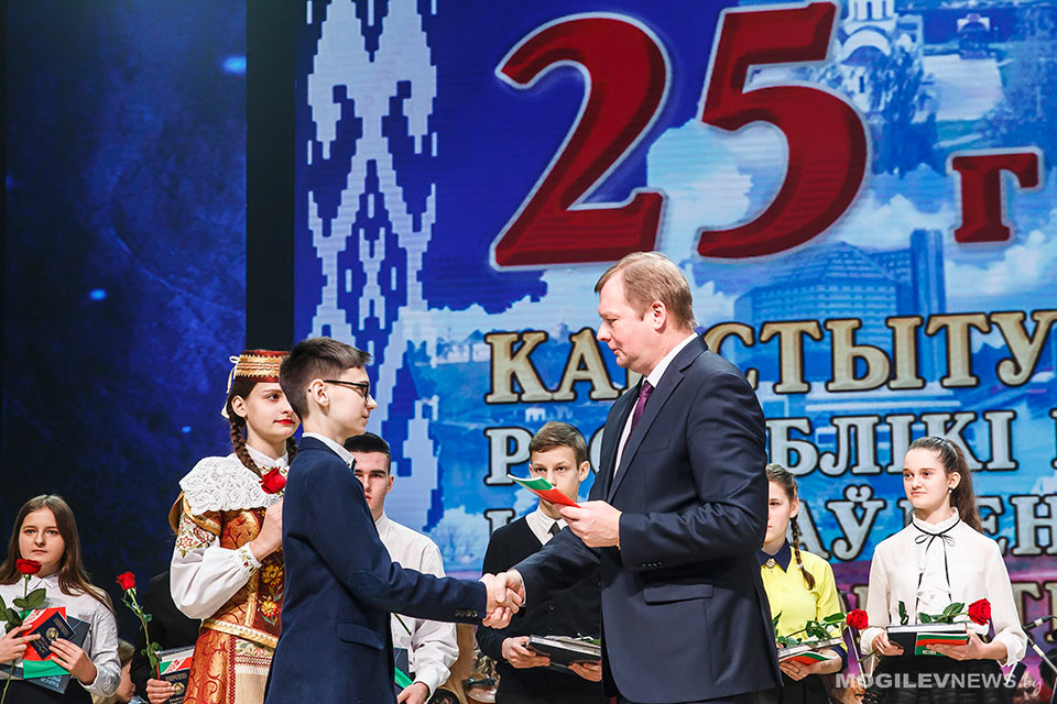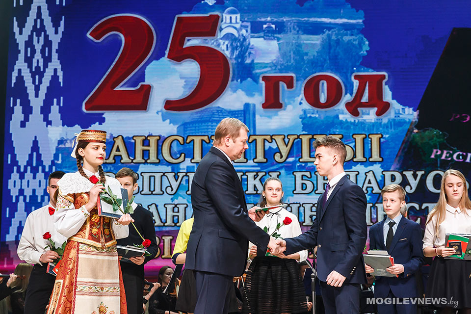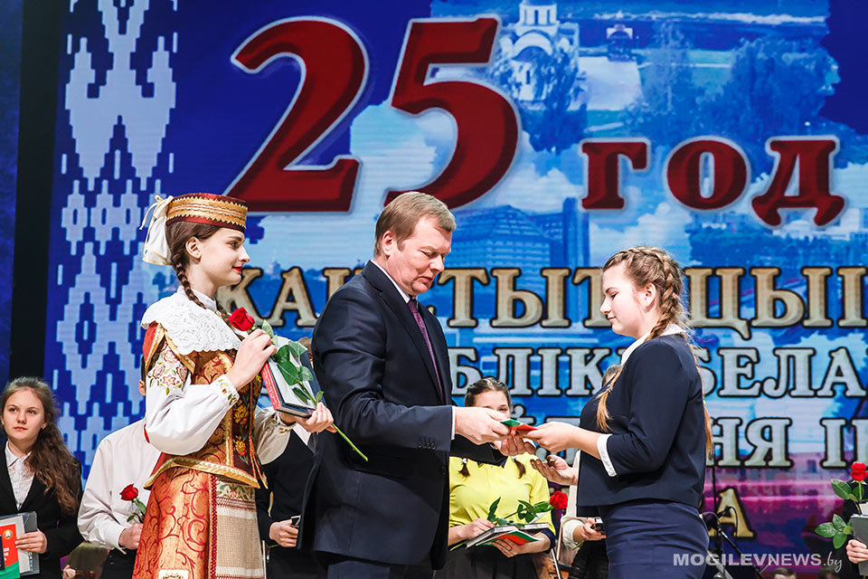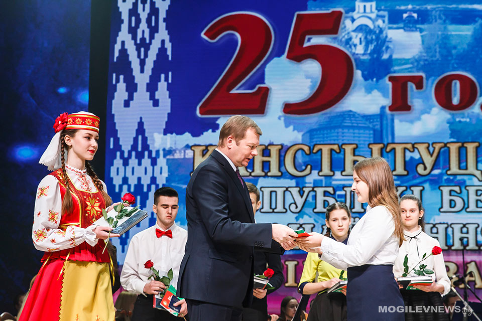 Праздничное мероприятие, посвященное 25-летию Конституции Республики Беларусь и становлению института президентства, прошло во Дворце культуры области. В рамках традиционной Всебелорусской акции «Мы — граждане Беларуси!» председатель Могилевского облисполкома Владимир Доманевский вручил паспорта 25 юношам и девушкам со всего региона — отличникам учебы, победителям предметных олимпиад, конкурсов и соревнований, активным участникам общественной жизни.