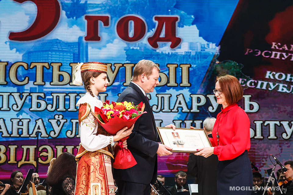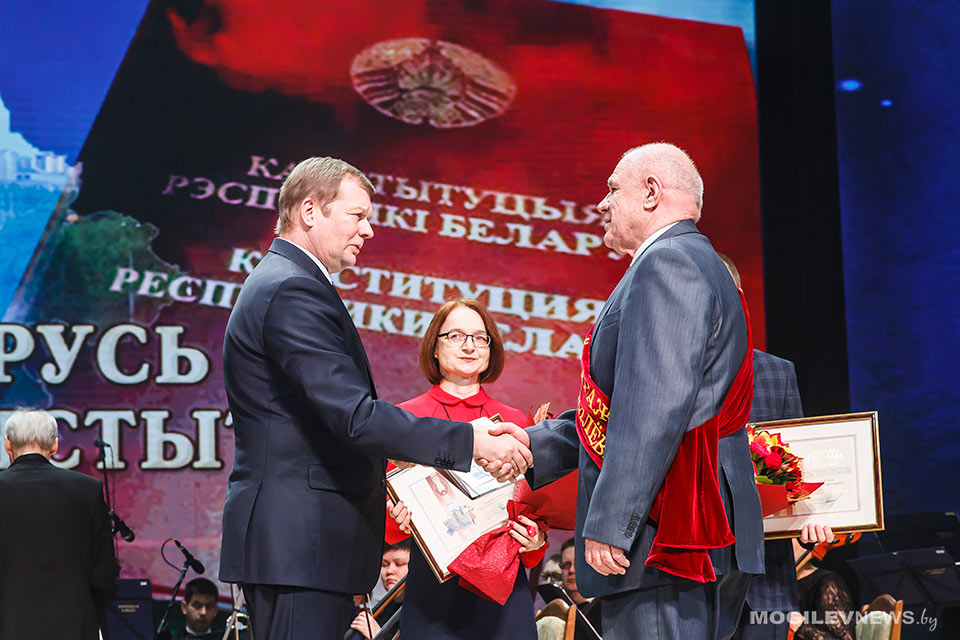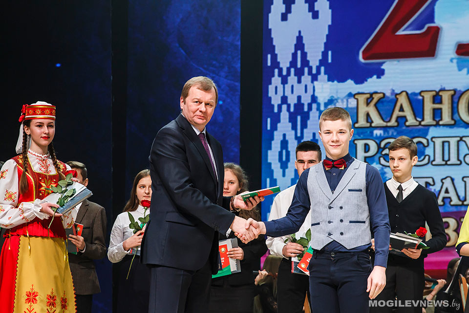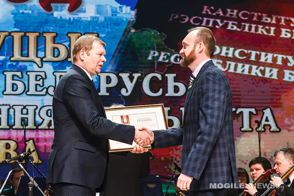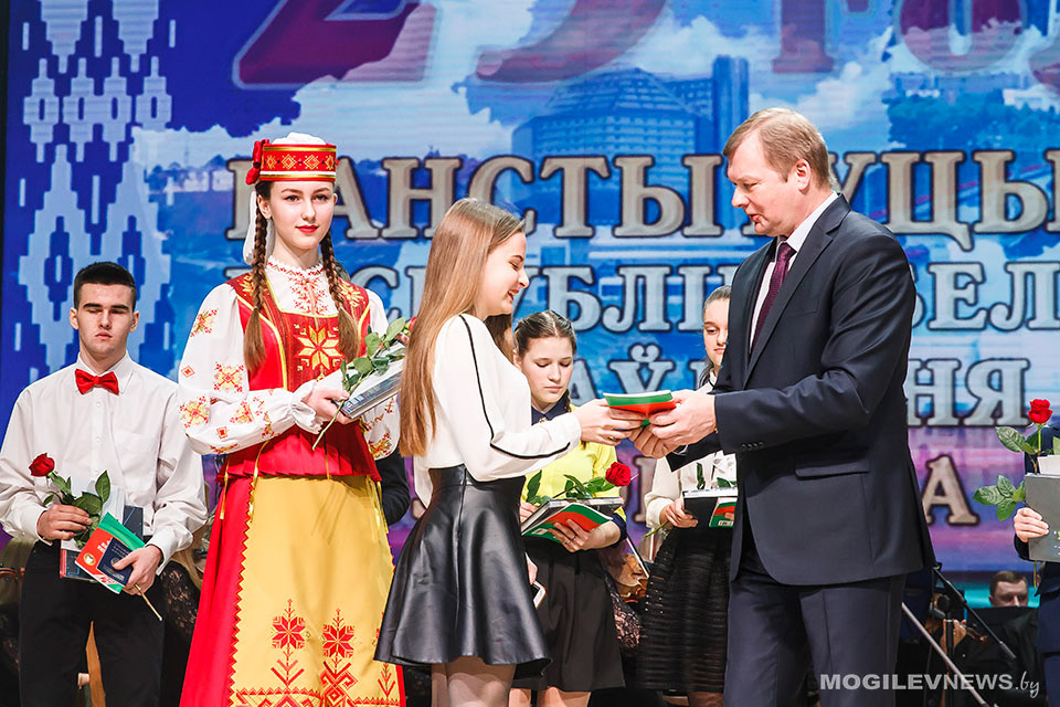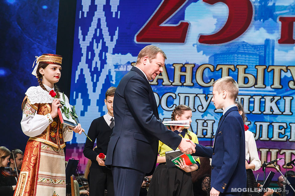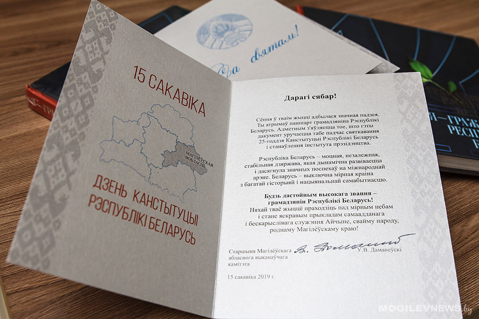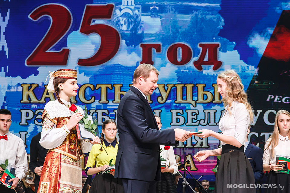 Праздничное мероприятие, посвященное 25-летию Конституции Республики Беларусь и становлению института президентства, прошло во Дворце культуры области. В рамках традиционной Всебелорусской акции «Мы — граждане Беларуси!» председатель Могилевского облисполкома Владимир Доманевский вручил паспорта 25 юношам и девушкам со всего региона — отличникам учебы, победителям предметных олимпиад, конкурсов и соревнований, активным участникам общественной жизни.