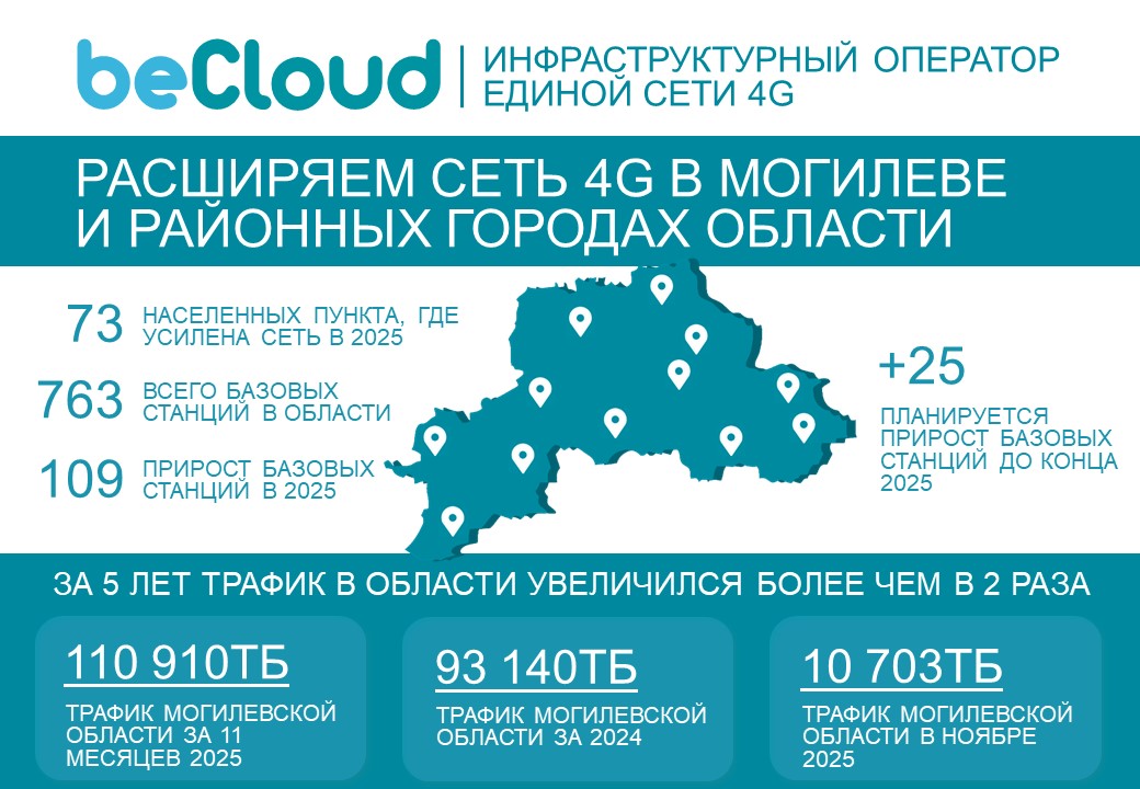 С начала 2025 года beCloud нарастил мощности сети четвертого поколения в двадцати районах региона, покрытие расширилось в десятках населенных пунктах, в частности: