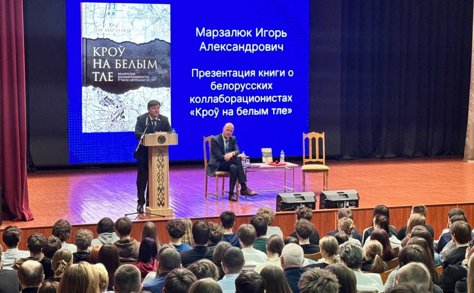 У Архітэктурна-будаўнічым каледжы прайшла прэзентацыя кнігі пра беларускіх калабарацыяністаў «Кроў на белым тле» старшыні Пастаяннай камісіі Палаты прадстаўнікоў Нацыянальнага сходу Рэспублікі Беларусь па адукацыі, культуры і навуцы Ігара Марзалюка.