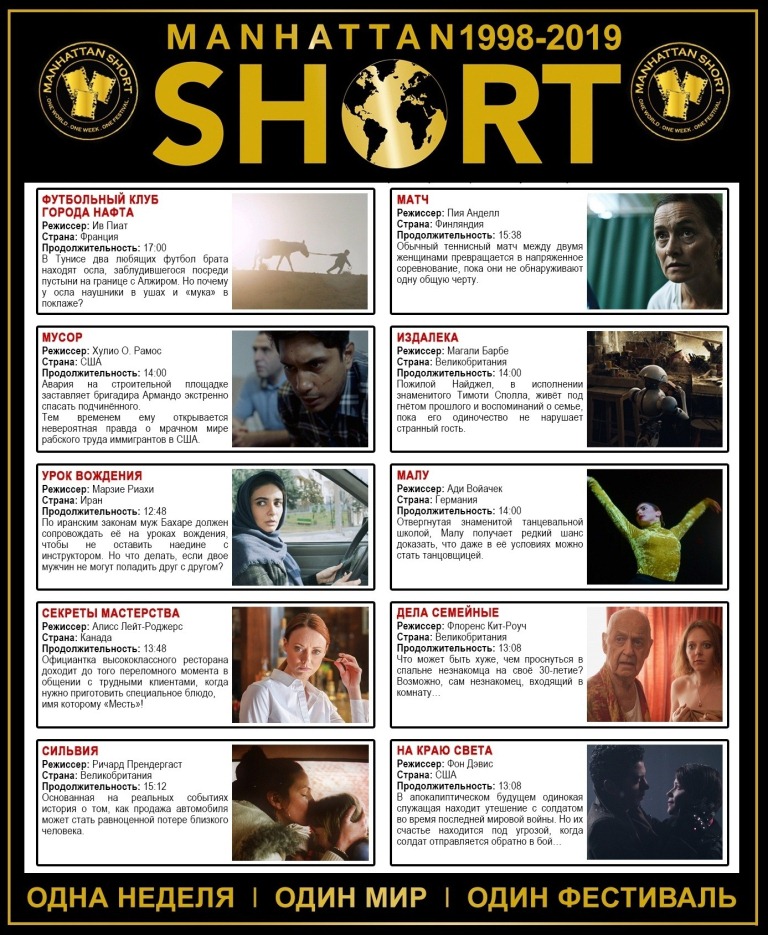 Каждую осень по всему миру более 100 тысяч кинолюбителей из 400 городов объединятся в мировое зрительское жюри, чтобы выбрать лучший фильм из 10 финалистов Манхэттенского фестиваля короткометражного кино (MANHATTAN SHORT 2019). Проголосовать за короткометражки могилевчане смогут с 26 по 29 сентября в кинотеатре «Родина».