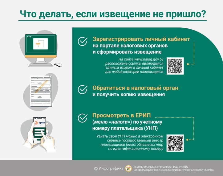 Если извещение не пришло, получить его или узнать сумму налогов, подлежащих уплате, можно несколькими способами. Первый — зарегистрировать личный кабинет плательщика на портале налоговых органов и самостоятельно сформировать извещение. Второй — обратиться в налоговый орган по месту своей регистрации и получить копию извещения. Третий — посмотреть в ЕРИП (меню «Налоги» по учетному номеру плательщика (УНП). Узнать свой УНП можно в электронном сервисе «Сведения из Государственного реестра плательщиков (иных обязанных лиц)».
