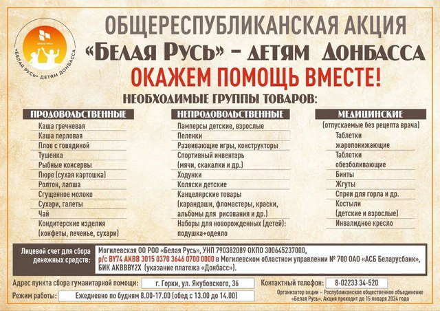 Республиканское общественное объединение «Белая Русь» с 15 декабря 2023 года по 15 января 2024 года проводит общереспубликанскую гуманитарную акцию «Белая Русь» — детям Донбасса», в рамках которой любой неравнодушный человек может оказать посильную помощь нуждающимся жителям Донбасса путем сбора необходимых групп товаров или путем перечисления денежных средств.