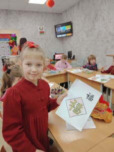 Изучив новогодние атрибуты, свойственные празднованию (парные предметы, мандарины, красные конверты, пельмени и многое другое), ребята сравнили, как празднуют Новый год в Китае и Беларуси. Познакомились не только с традициями китайского Нового года, но и с особенностями китайского языка. Ребята постарше создавали пазл «Дракон» и танцевали под песню 恭喜发财. Самые взрослые участники праздничного мероприятия практиковались в лепке пельменей и рисовании новогоднего плаката.