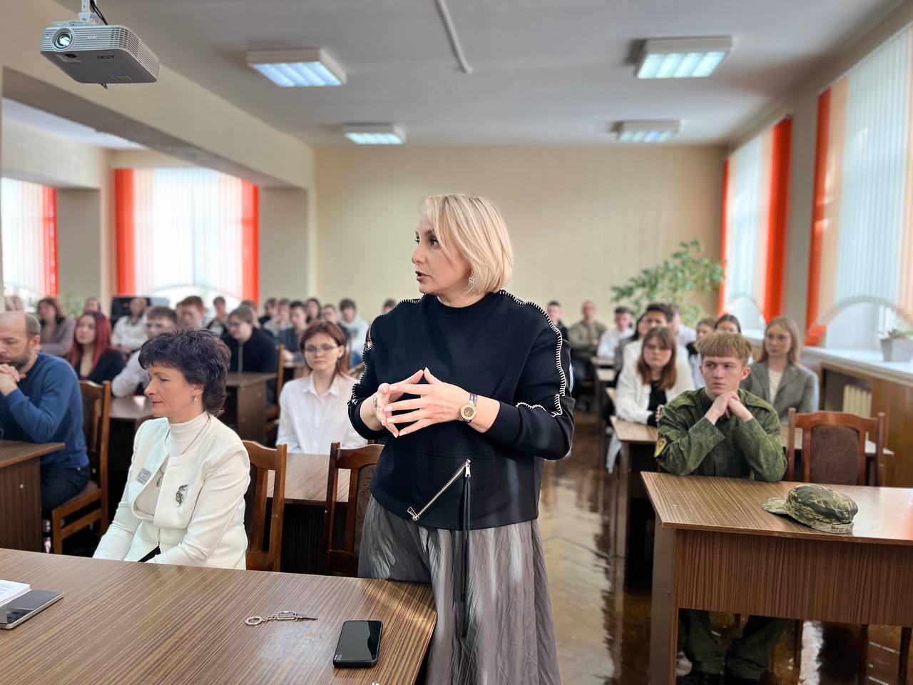 Начальник главного управления идеологической работы и по делам молодежи облисполкома Екатерина Музыченко встретилась с учащимися и трудовым коллективом колледжа, чтобы обсудить одну из главных тем — безопасность нашей страны, а главное, на чем она строится.