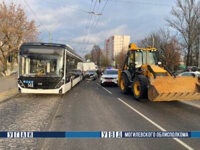 На улице Первомайской в Могилеве произошло ДТП с участием погрузчика, легкового автомобиля и троллейбуса. Как сообщили в ГАИ, 54-летний водитель экскаватора-погрузчика JSB, объезжая остановившийся на остановке троллейбус, выехал на крайнюю левую полосу, где столкнулся с автомобилем Volvo.