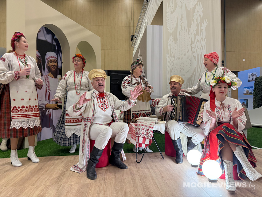 Народный фольклорный ансамбль «Таямніцы» Горецкого района удивляет гостей выставки «Моя Беларусь» танцем «Лявоніха па-Горацкі з выкрутасамі».
