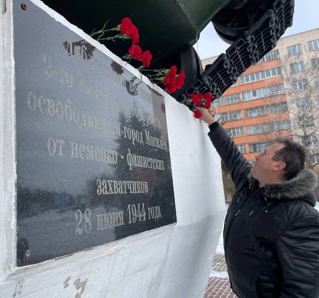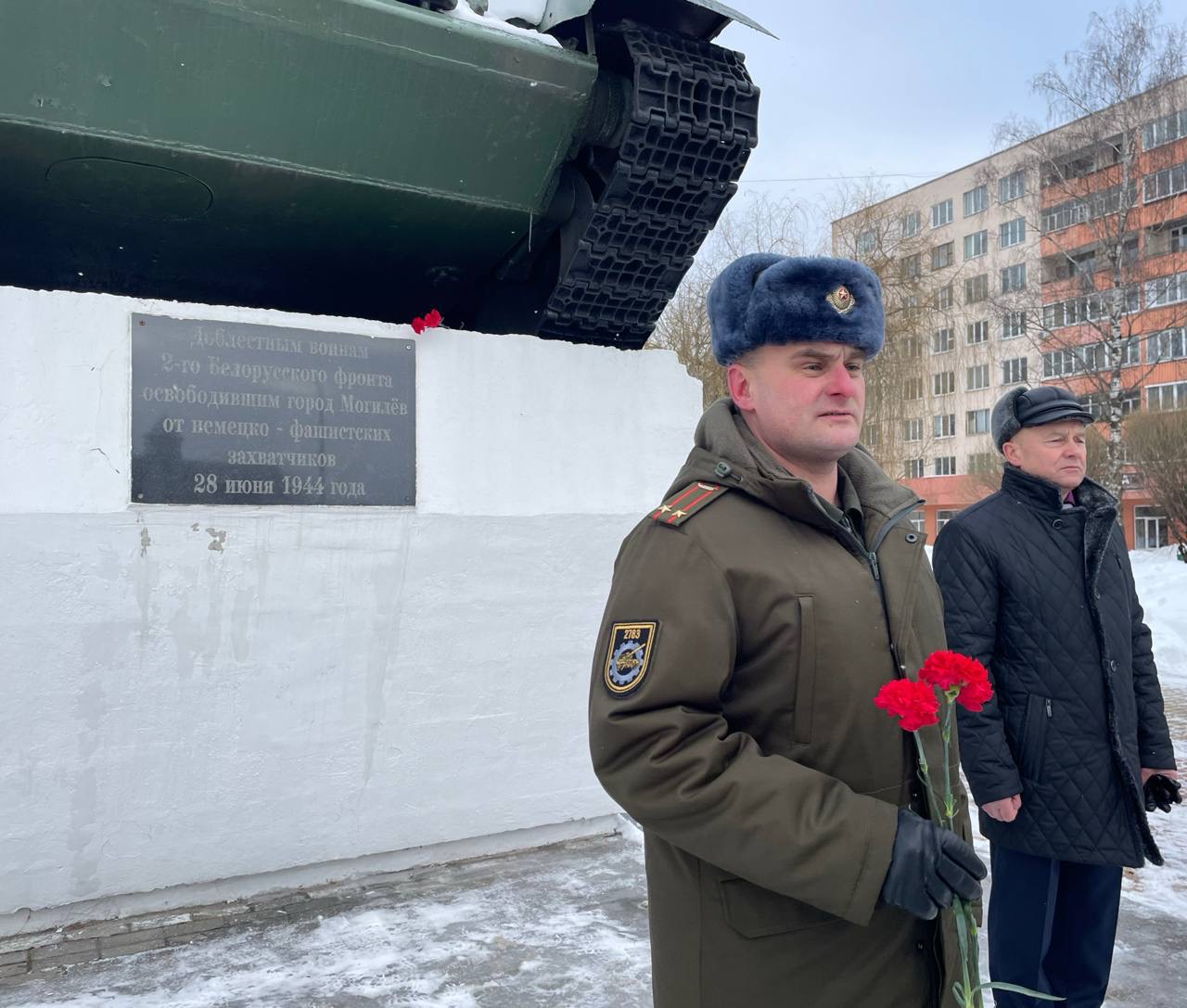 В преддверии Дня защитников Отечества и Вооруженных Сил Республики Беларусь в Могилеве прошла торжественная церемония возложения цветов к легендарному танку-памятнику Т-34.