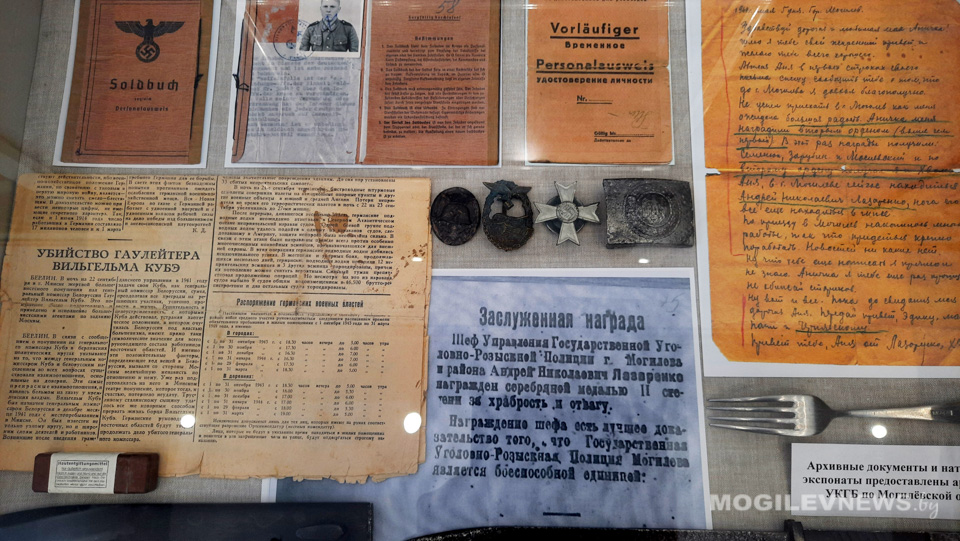 На выставке представлены: трудовая книжка для иностранного населения, которая выдавалась работникам приезжающим в Германию; воззвание к белорусскими рабочим и работницам, призывающее граждан к работе в Германии; немецкий журнал и газета на русском языке «Новый путь», которые распространялись на оккупированной территории; фотографии советских военнопленных, которые перешли на сторону фашистской Германии; оригинальные денежные знаки, которыми расплачивались с работниками; документ подтверждающий то, то 15 июня 1942 года немцы и карательный отряд Барчика расстреляли жителей д. Борки и входящих в него поселков и многие другие документы свидетельствующие о зверствах фашистов и их пособников на Могилевской земле.