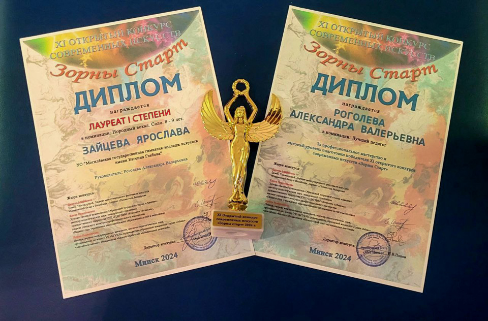 19 октября в Минске состоялся XI Открытый конкурс современных искусств «Зорны старт». В номинации «Народный вокал» в возрастной категории 8-9 лет диплом лауреата I степени получила Зайцева Ярослава, учащаяся Могилевской государственной гимназии-колледжа искусств имени Евгения Глебова.