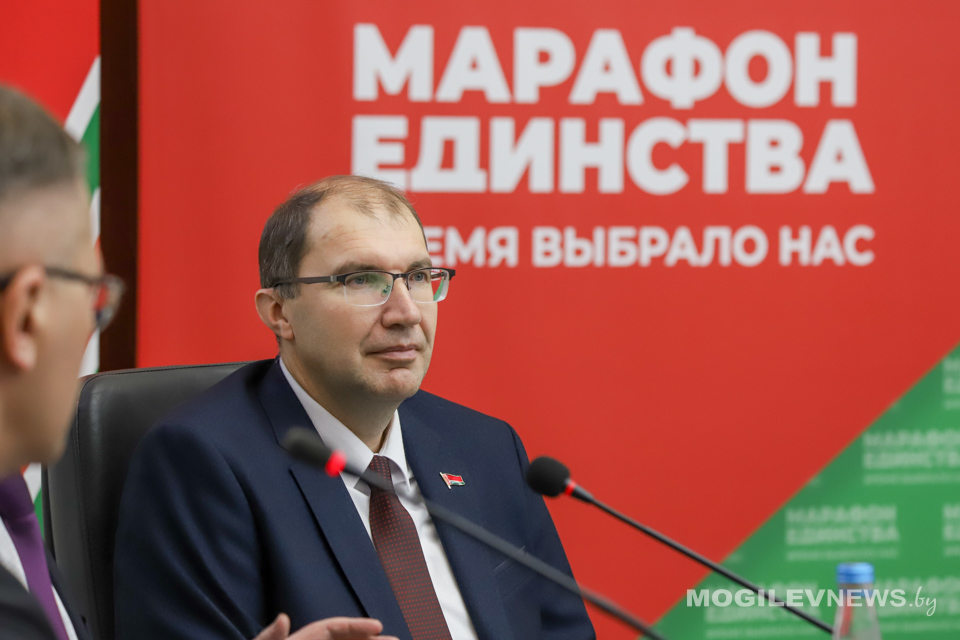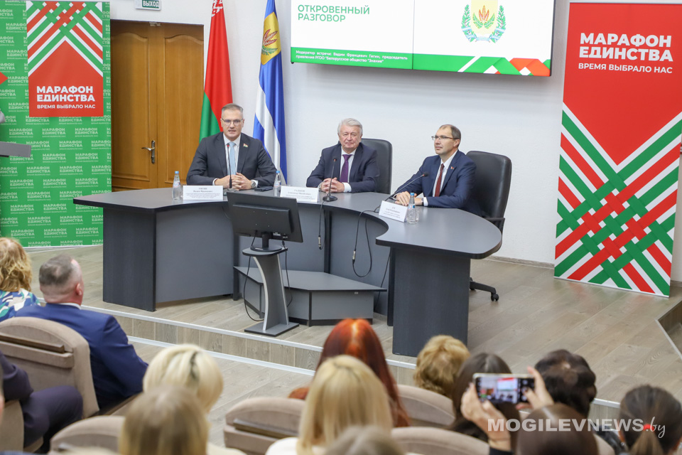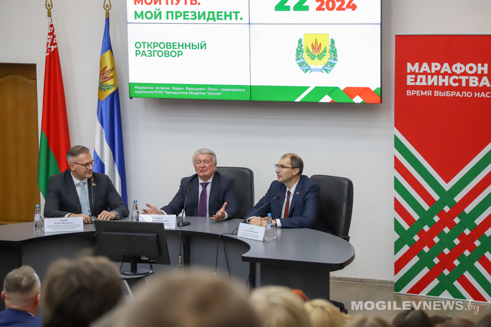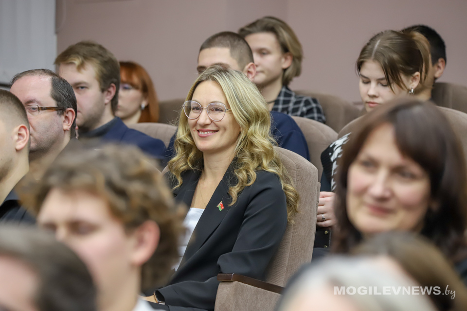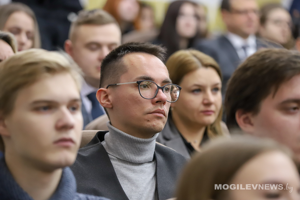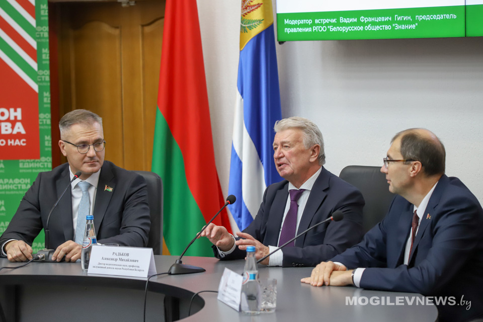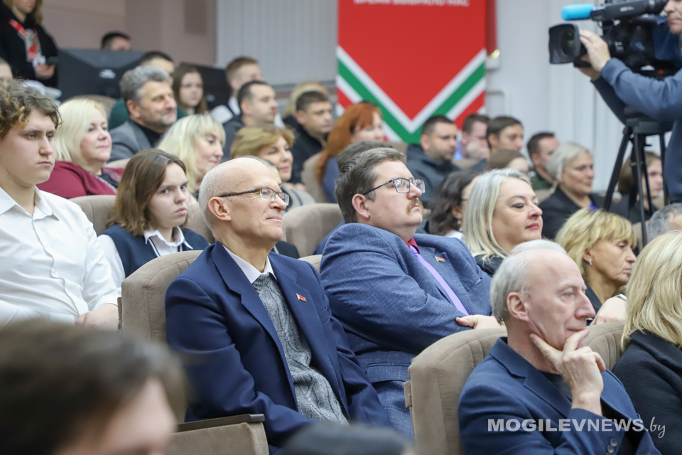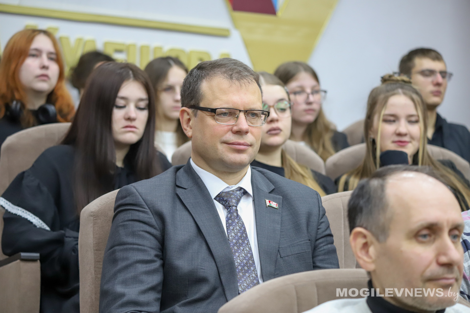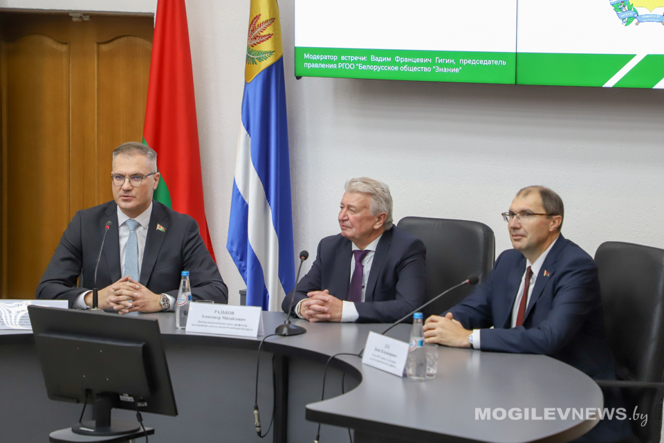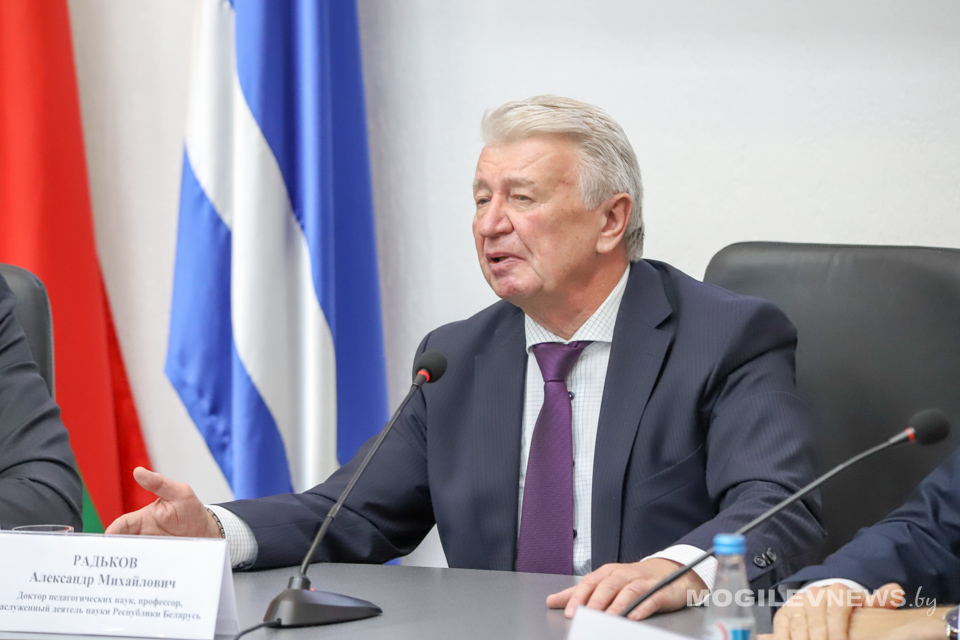 В МГУ им. А.А. Кулешова прошла встреча студентов и представителей общественности с доктором педагогических наук, профессором, заслуженным деятелем науки Республики Беларусь Александром Радьковым. На встрече также присутствовал ректор Могилевского государственного университета имени А.А. Кулешова Денис Дук, а модератором мероприятия выступил генеральный директор Национальной библиотеки Беларуси, депутат Палаты представителей, председатель правления РГОО «Белорусское общество «Знание» Вадим Гигин.