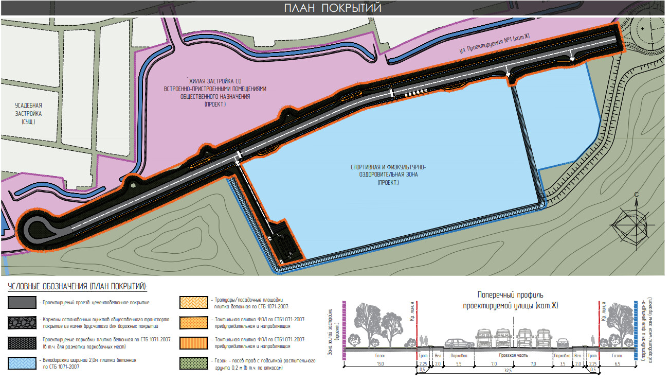Строительство не затронет частный сектор: дорогу разместят на участках, частично занятых огородами, кустарником и болотистой местностью. Магистраль будет включать четырехполосную проезжую часть, парковки, остановки общественного транспорта, тротуары, велодорожки, озеленение, уличное освещение и малые архитектурные формы (скамейки, урны).
