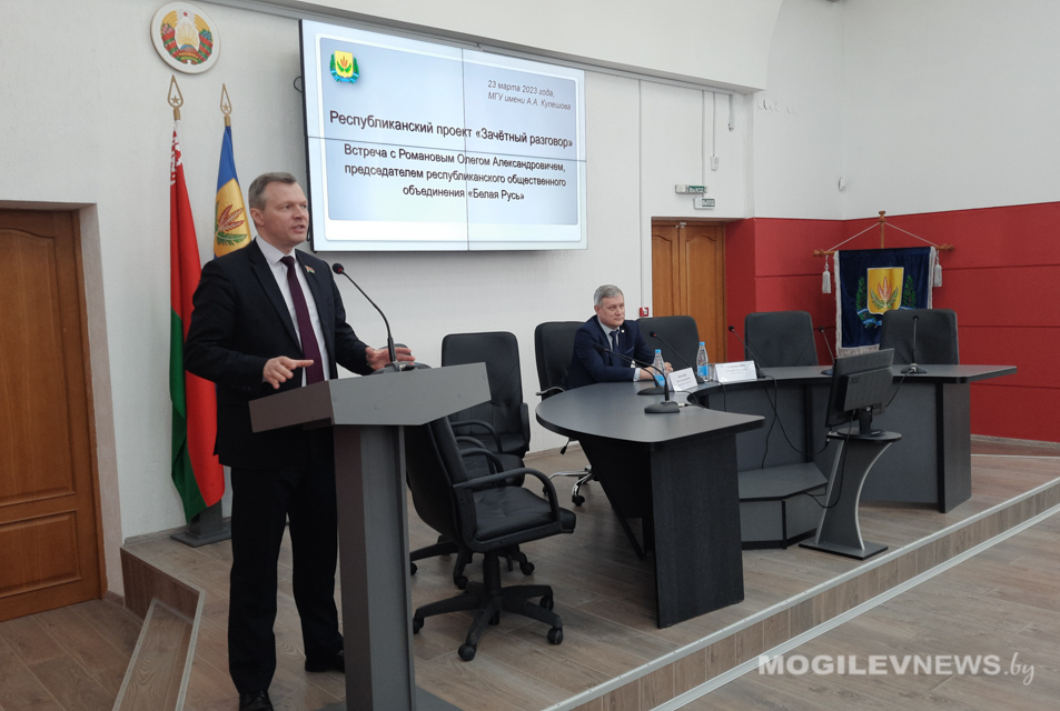 Очередная диалоговая площадка информационно-просветительского проекта «Зачётный разговор» прошла на базе МГУ им.А.А.Кулешова. В новом формате молодежь общалась с председателем РОО «Белая Русь» и руководителем Белорусской партии «Белая Русь» Олегом Романовым.