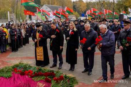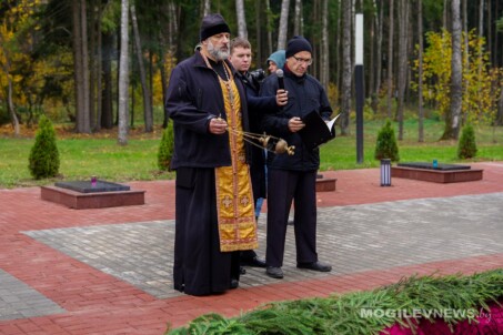 Благочинный церквей Могилевского городского округа протоирей Сергей Лобода провел литию по безвинно погибшим мирным жителям. После минуты молчания и оружейного залпа участники церемонии возложили цветы к подножию памятника жертвам геноцида и к братским захоронениям.
