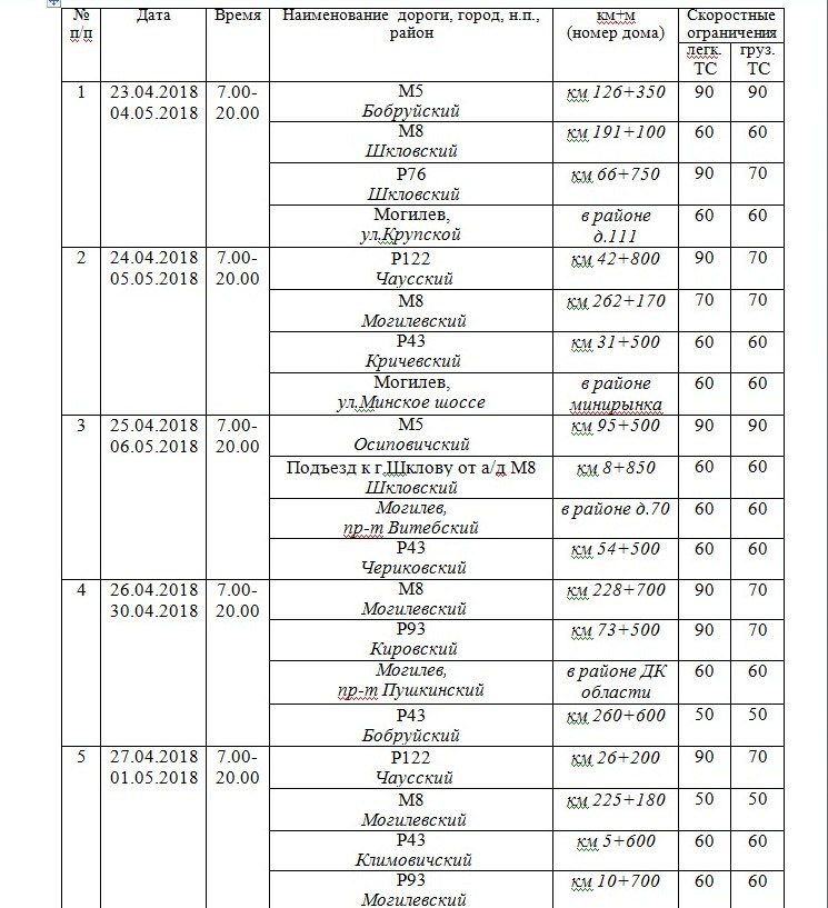 О работе мобильных датчиков контроля скорости на территории Могилевской области с 23 апреля по 6 мая сообщили в ГАИ (2018)