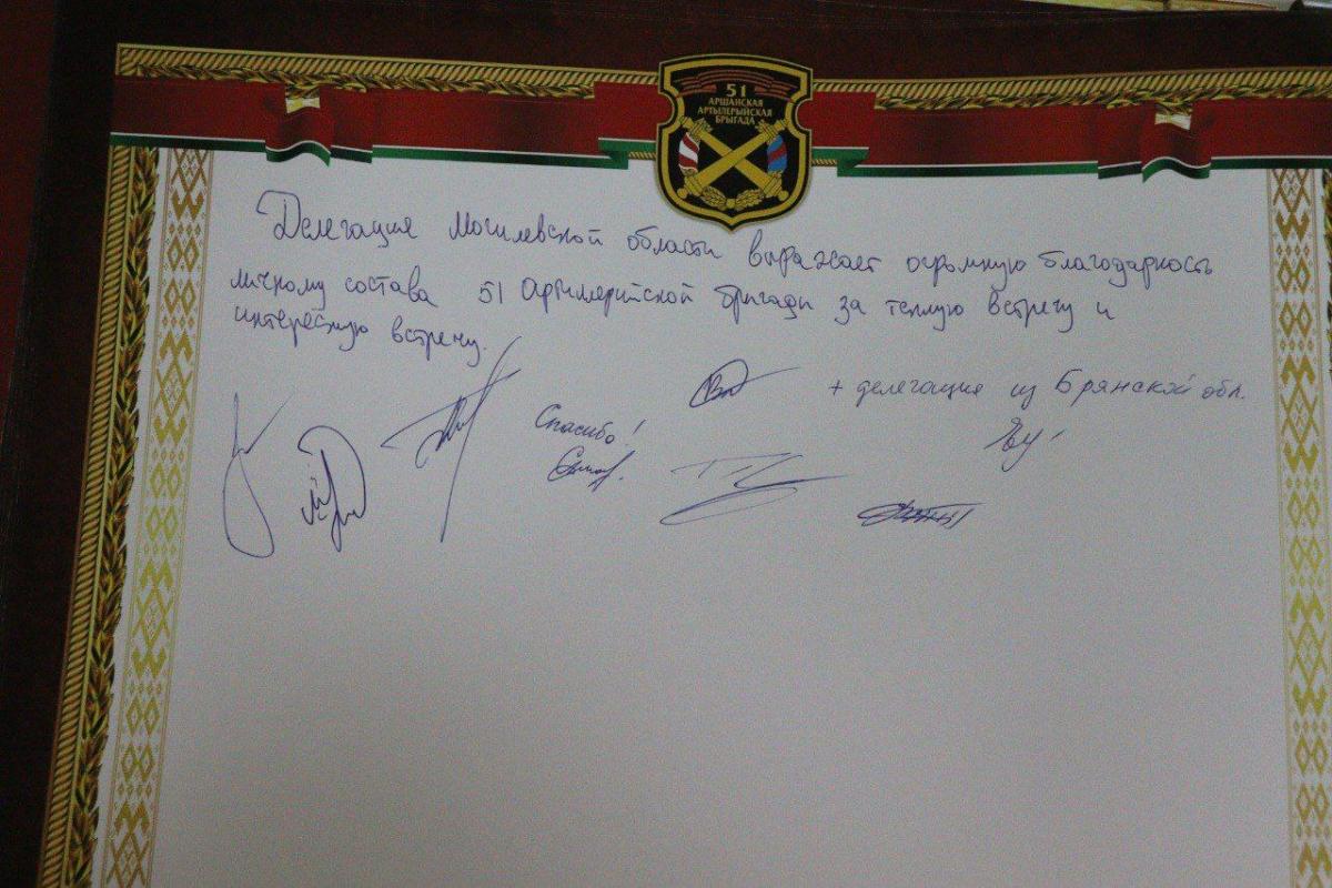 На правах хозяев гостей принимали не только военнослужащие 51 артбригады, но и участники военно-патриотического клуба «Гарнизон». Последние также получили возможность онакомиться с экспозицией передвижного музея, которая расказывает о событиях Великой Отечественной войны, которые происходили на территориях двух соседних областей: Могилевской (Республика Беларусь) и Брянской (Российская Федерация).