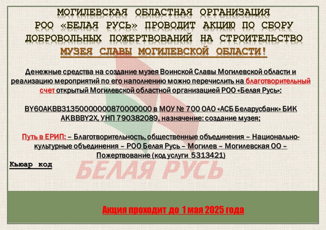 Денежные средства на создание музея Славы Могилевской области в районе мемориального комплекса «Буйничское поле» можно перечислить на открытый Могилевской областной организаций РОО «Белая Русь» благотворительный расчетный счет: