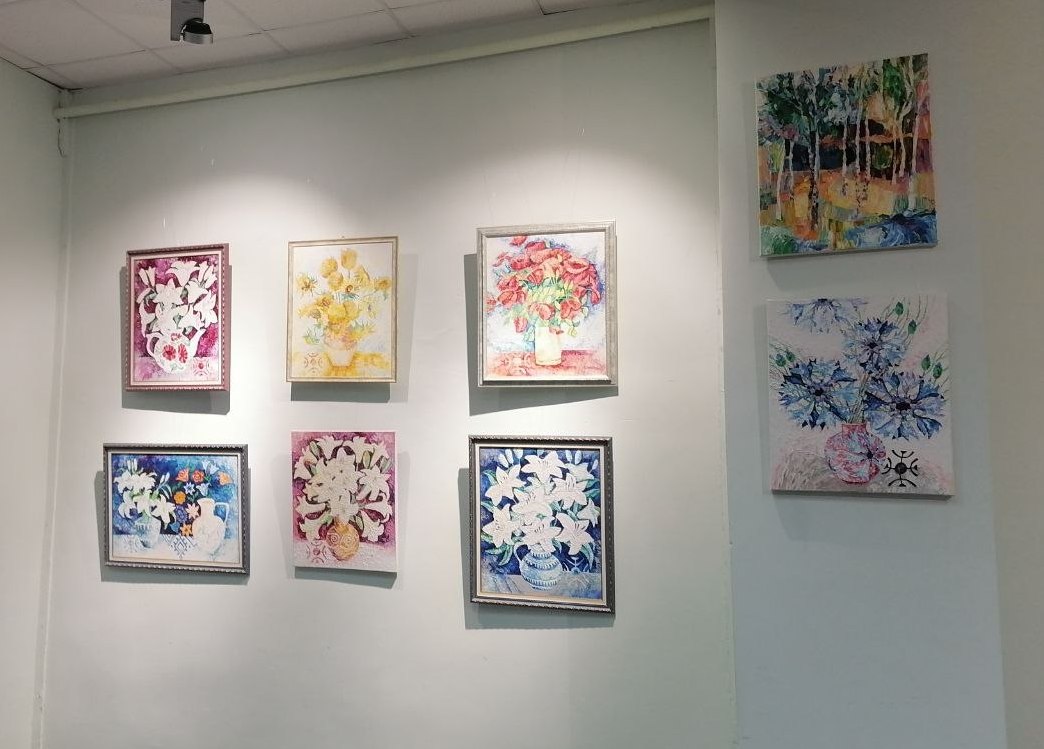 Среди работ — гобелены, авторская текстильная техника, пояса, батик. Также в экспозиции — живопись масляными красками на холсте и графические листы на бумаге.
