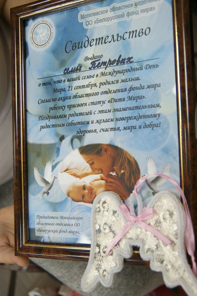 — Областная акция «Дитя мира» проходит в области с 2009 года. Мы поздравляем родителей и выдаем им свидетельство о том, что в их семье в Международный день мира родился малыш, а ребенку присваиваем статус «Дитя мира», — отметила председатель Могилевского областного отделения ОО «Белорусский фонд мира» Валентина Мельникова. — За десять лет в области в 370 семьях родились 378 детей, из них восемь пар двойняшек. Акция «Дитя мира» важна во всех отношениях. Она во многом стимулирует семьи жить в мире и согласии, а детей — соответствовать данному почетному статусу, быть «человеком мира».