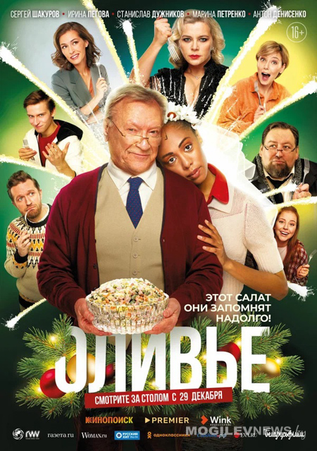 «Оливье» (Беларусь, Россия, 2022, комедия; В канун Нового года известный сатирик Михаил Верин собирает за праздничным столом своих детей и внуков, чтобы по давней семейной традиции отведать знаменитый дедушкин салат оливье. Однако в квартире их неожиданно встречает молодая темнокожая красавица, которую дед представляет, как свою невесту. Эта новость оказывает на родственников эффект разорвавшейся бомбы и запускает цепь событий, которые превратят праздничный семейный ужин в комедийный балаган и фейерверк искрометных новогодних стендапов);