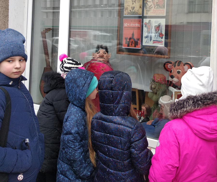 Выставку театральных кукол из спектаклей прошлых лет можно посмотреть в окнах центральной городской библиотеки им.К.Маркса