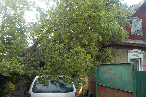 Одно из деревьев упало на улице Глинки — на частный гараж. Еще одно — на машину, стоящую на бульваре Приберезинском.
