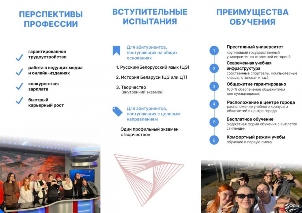 Вступительные испытания для поступления на специальность «Журналистика («Веб-журналистика)»: Русский язык (или Белорусский язык) (ЦЭ), История Беларуси (ЦЭ или ЦТ), Творчество (внутренний экзамен).