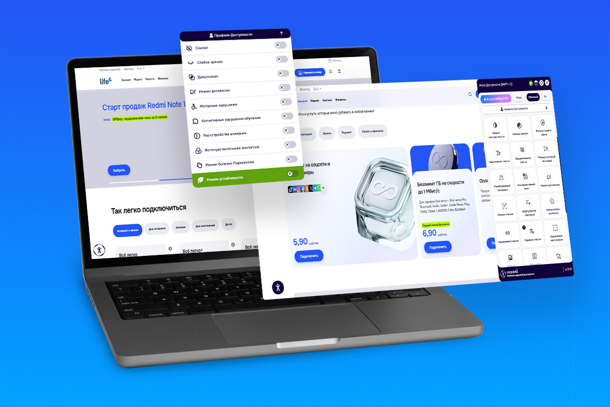 Цифровой оператор Life встроил виджет, который адаптирует интерфейс сайта life.by для пользователей с дополнительными потребностями. Он помогает людям с особенностями зрения, слуха, моторики, внимания, памяти и эпилепсией настроить сайт под свои нужды.