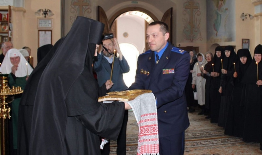 Начальник управления Следственного комитета по Могилевской области Андреем Лисом и начальник управления КГБ по Могилевской области Александром Тереховым в Свято-Никольский женский монастырь передали икону Святого Николая Чудотворца, похищенная в сентябре 2016 года.