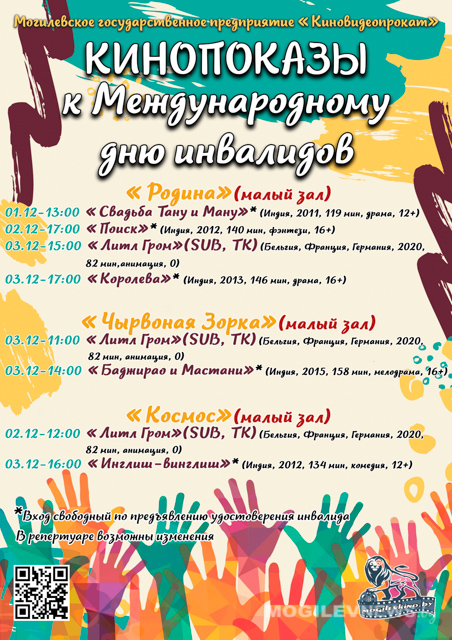 Могилевское государственное предприятие «Киновидеопрокат» с 1 по 3 декабря приглашает зрителей с ограниченными возможностями в кинотеатры «Родина», «Чырвоная Зорка», «Космос» на кинопоказы, приуроченные к Международному дню инвалидов.