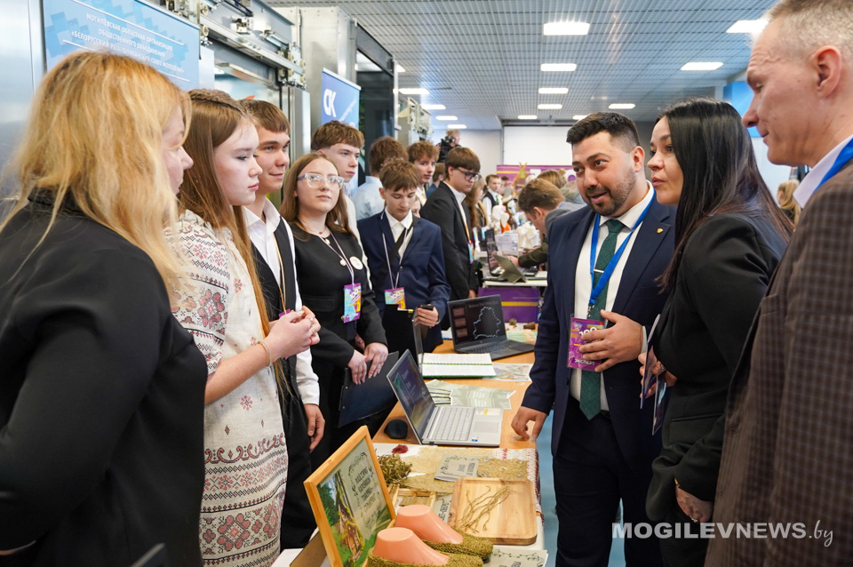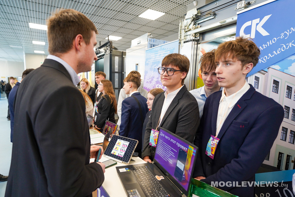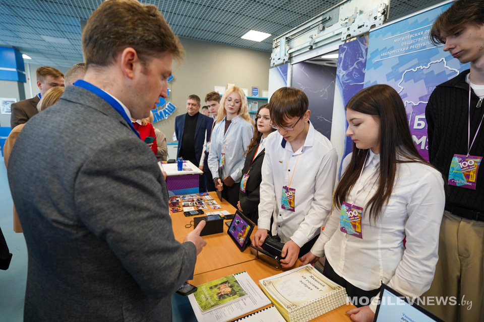 Участники защищают свои проекты в 13 номинациях. Например, Егор Коршунов из Климовичской гимназии на конкурсе «100 идей для Беларуси» представляет проект «Войной изломанное детство», а Вячеслав Денисов из Могилевского государственного электротехнического колледжа презентует членам жюри проект «НаноДвигатель».