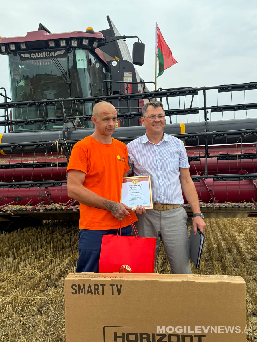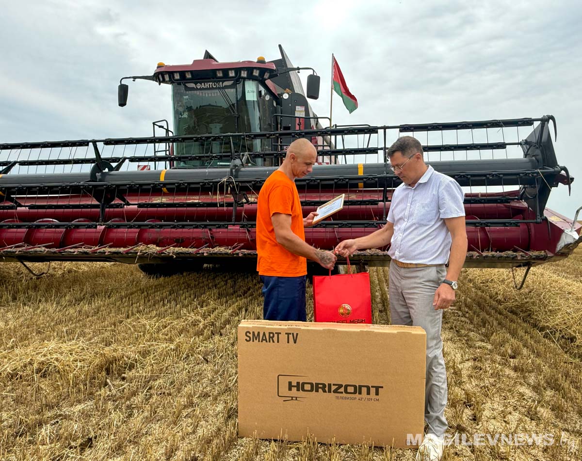 Так, заместитель начальника управления маркетинга ОАО «Гомсельмаш» Сергей Марков сегодня прямо в поле вблизи деревни Браково чествовал передовика уборочной — механизатора ЗАО «Агрокомбинат «Заря» Могилевского района Сергея Алленкова с высокими производственными показателями — за намолот первой тысячи тонн зерна на новом зерноуборочном комбайне GOMSELMASH. На данный момент аграрий задействован на уборке озимой пшеницы.
