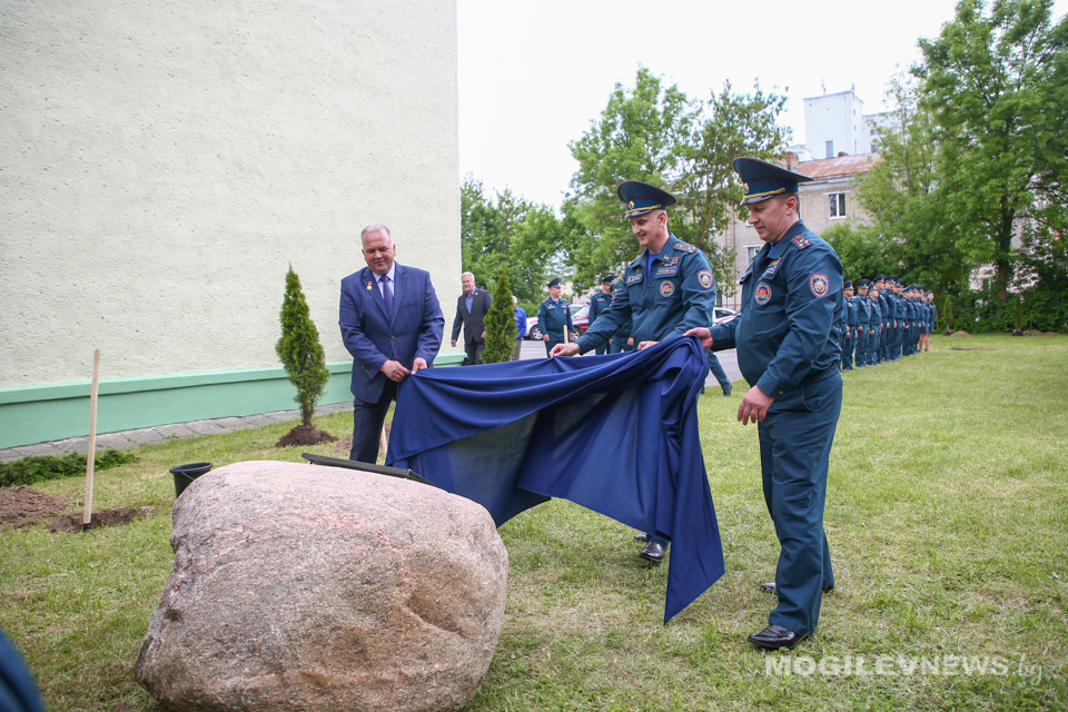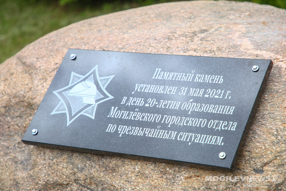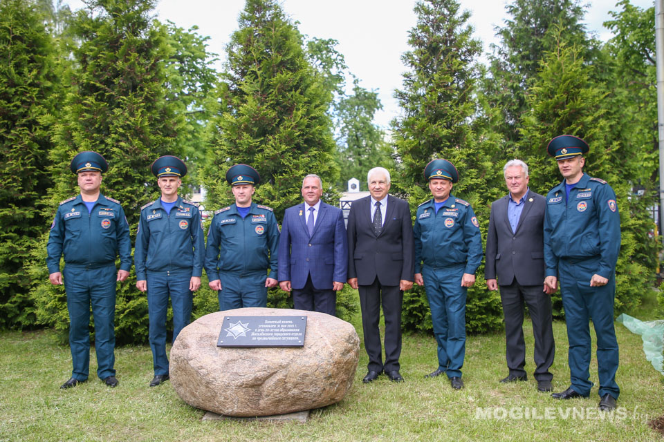 Памятный знак открыли в честь 20-летия Могилевского городского отдела по ЧС. Фото