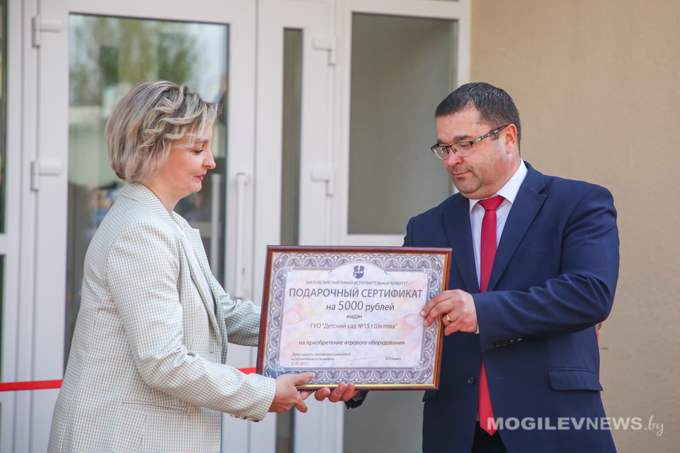 Еще одним приятным подарком стали сертификаты на общую сумму 15 тысяч рублей от Могилевского облисполкома и Шкловского райисполкома. Эти деньги будут направлены на укрепление материально-технической базы детского сада.